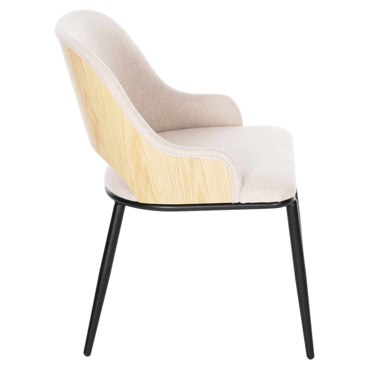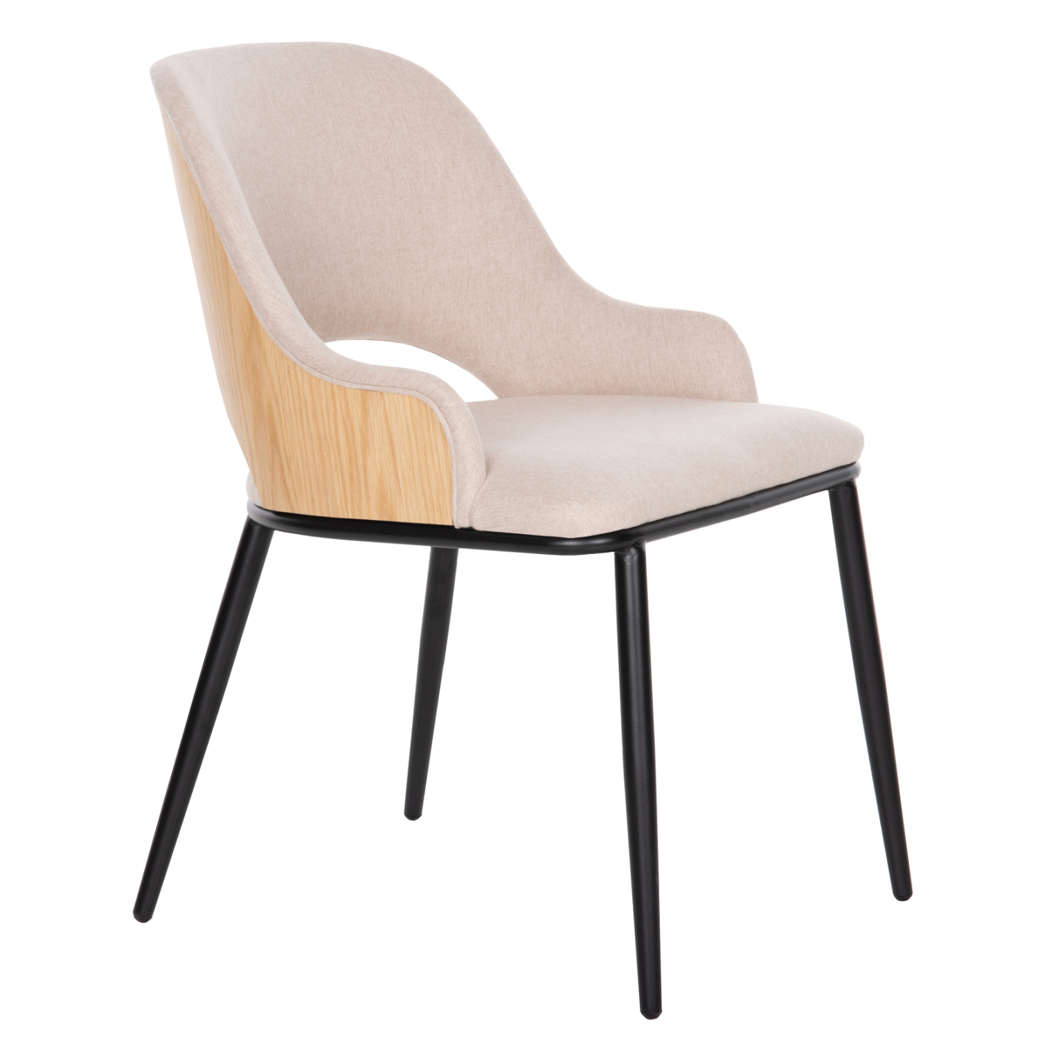 Καρέκλα DELF σε ΜΠΕΖ απόχρωση με ξύλινη πλάτη σε OAK χρώμα, και ΜΑΥΡΑ μεταλλικά πόδια. Η ξύλινη πλάτη είναι κυρτή και αναπαυτική. Μια καρέκλα που δίνει αέρα πολυτέλειας σε οποιοδήποτε χώρο. Ποιοτική και κομψή σίγουρα θα τραβήξει τα βλέμματα.