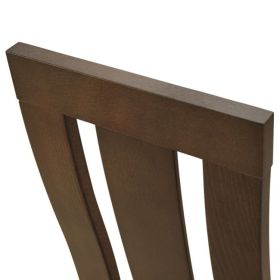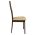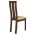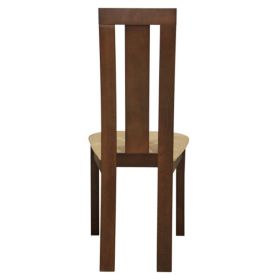 Καρέκλα τραπεζαρίας από μασίφ σκελετό σε καρυδί χρώμα. Η πλάτη της καρέκλας διαθέτει ένα επιπλέον τμήμα από ξύλο και κάθισμα με υφασμάτινη επένδυση σε μπεζ χρώμα.