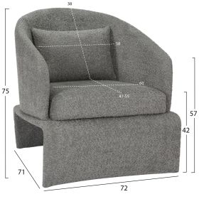 Ο σκελετός της πολυθρόνας είναι μεταλλικός με ηλεκτροστατική βαφή, ενώ ολόκληρη η επένδυση έχει γίνει με μπουκλέ ύφασμα εξαιρετικής ποιότητας και υφής. Μπουκλέ λέγεται οποιοδήποτε ύφασμα που έχει κόμπο-μπούκλα στην ύφανσή του. Κατασκευάζεται από σχεδόν όλες τις πρώτες ύλες (αν και συνήθως είναι συνθετικό) με ειδικές κλωστές με κόμπους ή πολύ στριμμένα νήματα, έτσι ώστε να έχει σγουρή επιφάνεια. Δεν τσαλακώνει και μπορεί να είναι μονόχρωμο, μελανζέ ,καρώ ή τουιντ.