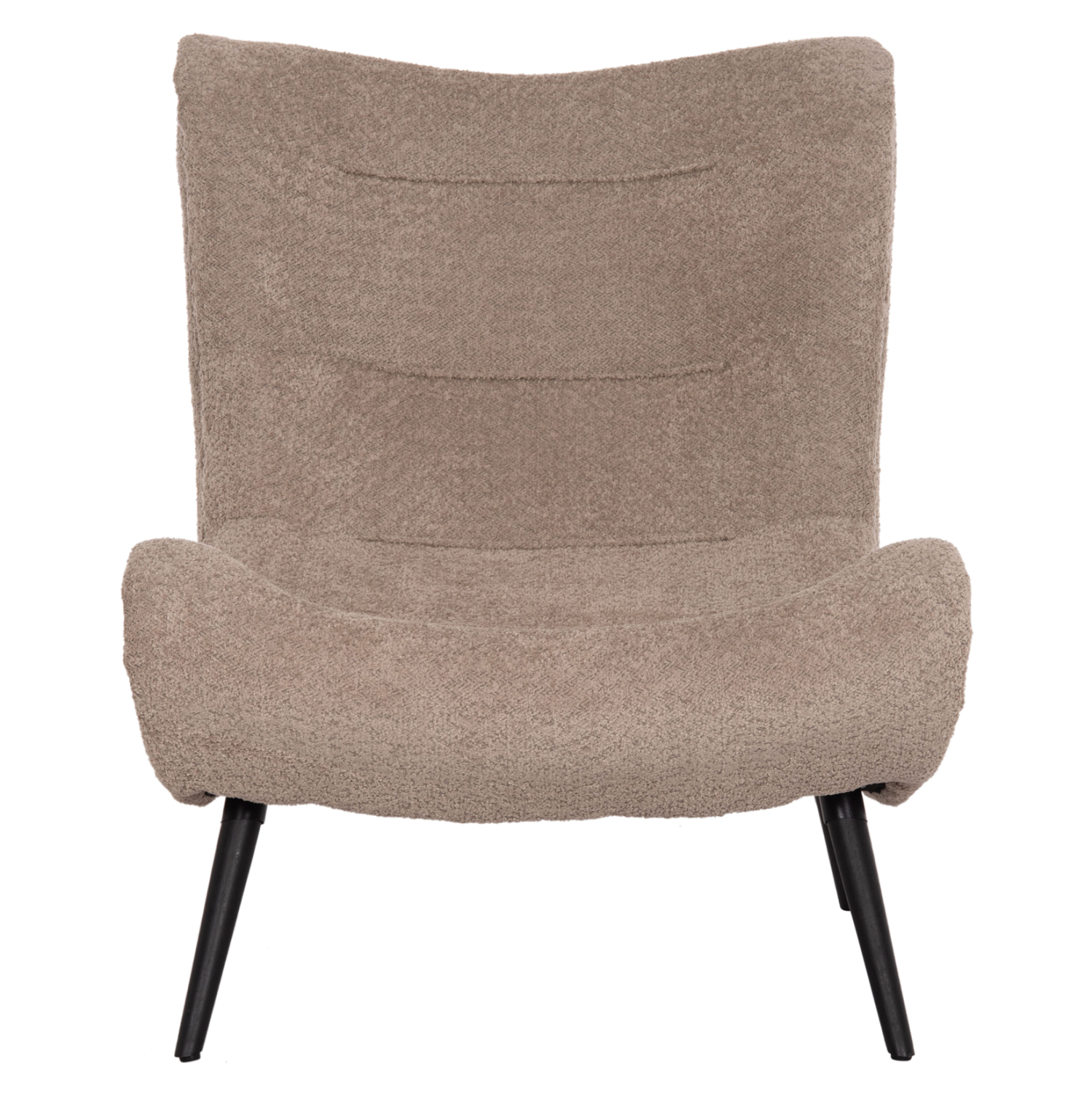 Αυτή είναι η πολυθρόνα/Lounge Chair BRYM σε ΣΚΟΥΡΟ ΜΠΕΖ χρώμα με μαύρα ξύλινα πόδια. Δεν διαθέτει μπράτσα και ο σχεδιασμός της με την μόνιμη ανάκλιση και την ψηλή πλάτη την καθιστά εξαιρετικά αναπαυτική. Το μπουκλέ ύφασμα της επένδυσης προσφέρει μια ζεστή αίσθηση που θα λατρέψετε!
