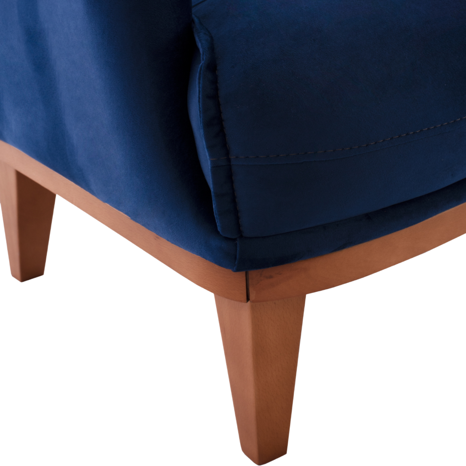 Αλλά δεν είναι μόνο το χρώμα και το καπιτονέ που κάνουν αυτή την μπερζέρα να ξεχωρίζει. Τα πόδια είναι ψηλά και ακριβώς πάνω από τα πόδια υπάρχει ένα ξύλινο πλαίσιο που διατρέχει ολόκληρη την μπερζέρα, σε φυσικό χρώμα ξύλου, με αποτέλεσμα να δημιουργείται μια πανέμορφη διχρωμία με το έντονο μπλε της επένδυσης.