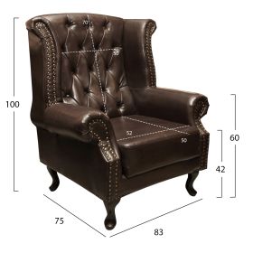 Αυτή είναι η μπερζέρα ΗΜ0053.01 σε σκούρο ΚΑΦΕ χρώμα και ξύλινα πόδια σε μαύρο χρώμα. Το χαρακτηριστικό που κάνει αυτή την πολυθρόνα να ξεχωρίζει είναι ότι η τεχνοτροπία της είναι σε στυλ Chesterfield, πράγμα που δίνει την αίσθηση κύρους και πολυτέλειας οπουδήποτε κι αν χρησιμοποιηθεί. Το κύριο χαρακτηριστικό αυτού του στυλ, είναι η επένδυση με PU leather, το οποίο στην πλάτη είναι σε βαθιά καπιτονέ τεχνοτροπία, υπηρετώντας το στυλ Chesterfield.