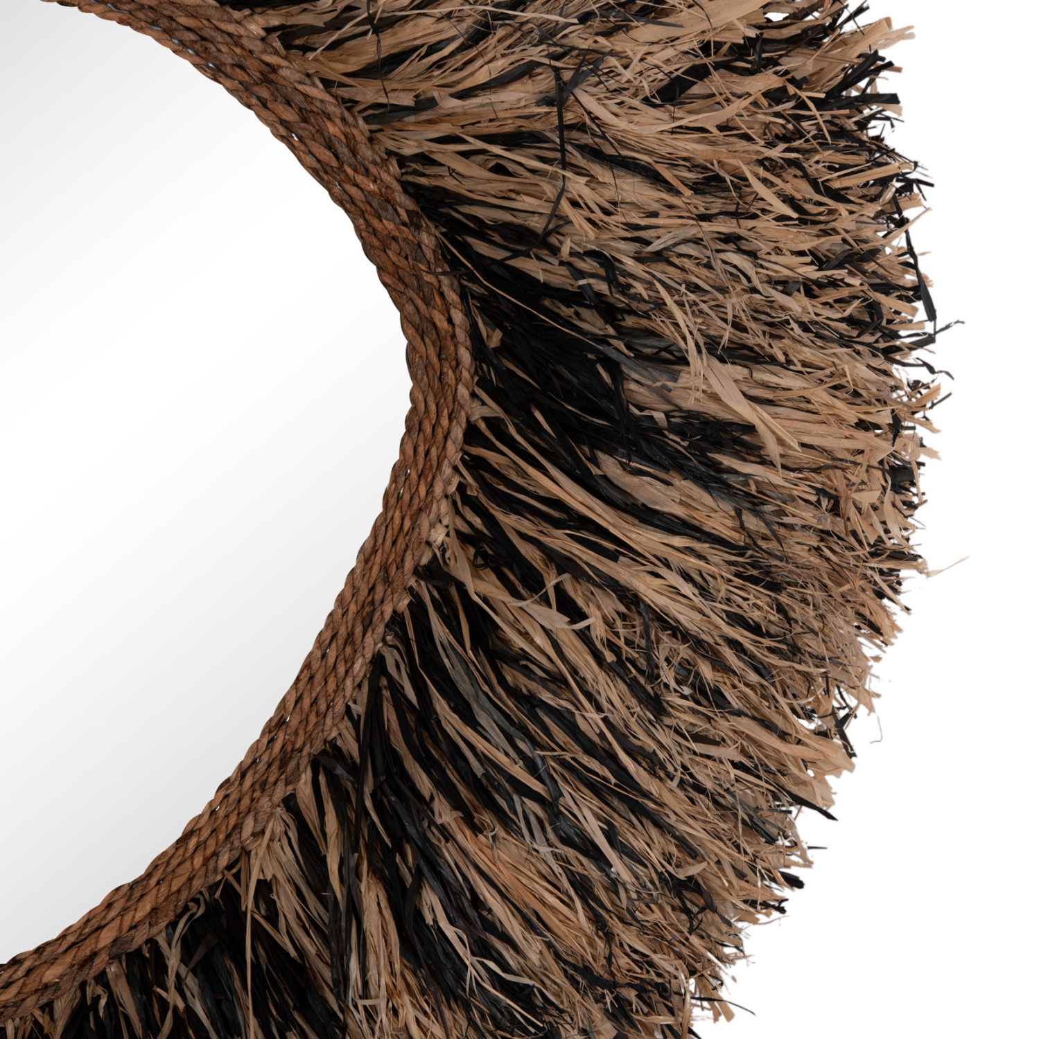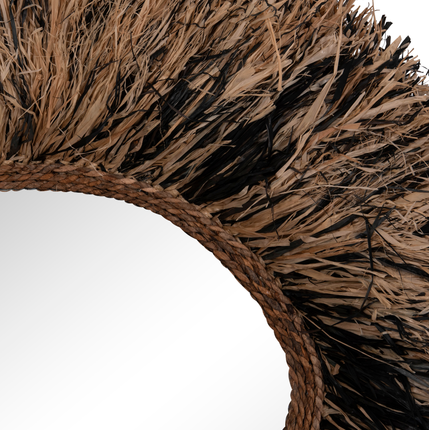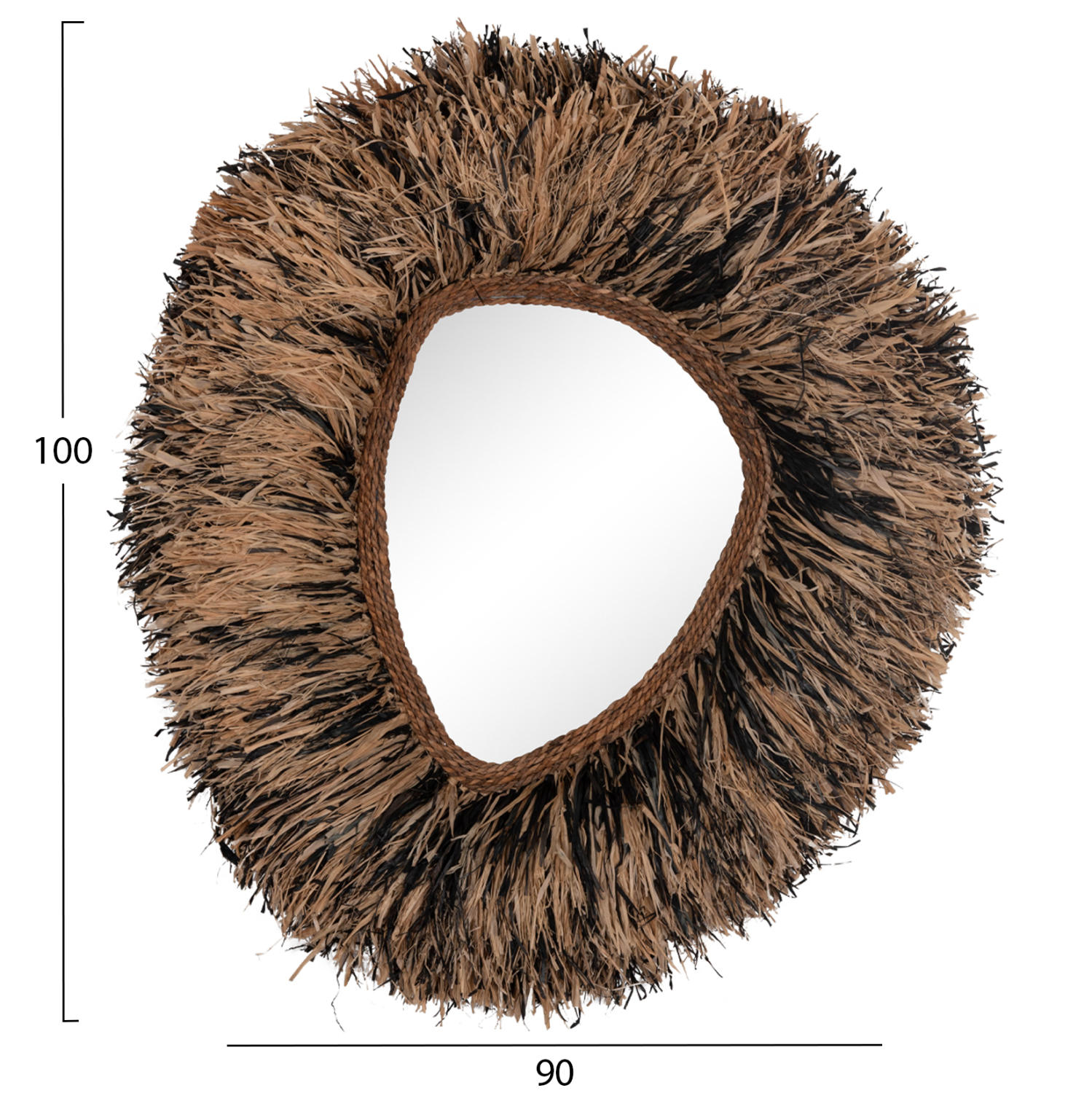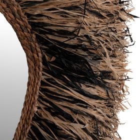 O καθρέπτης GRESSO είναι πραγματικά ένα εντυπωσιακό κομμάτι στην διακόσμηση του χώρου σας! Το design του είναι μοναδικό με το αριστοτεχνικά κατασκευασμένο ακανόνιστο πλαίσιο από ίνες φλοιού μπανάνας, το οποίο στο κέντρο του «φιλοξενεί» τον καθρέπτη. Οι ίνες είναι σε μαύρο και φυσικό χρώμα και ο καθρέπτης αποτελεί ένα χαρακτηριστικό δείγμα boho αισθητικής και διακόσμησης. Είναι ιδανικός τόσο για το σπίτι όσο και για επαγγελματικούς χώρους όπως ξενοδοχεία, Airbnb, χώρους εστίασης ως διακοσμητικό στοιχείο κτλ.