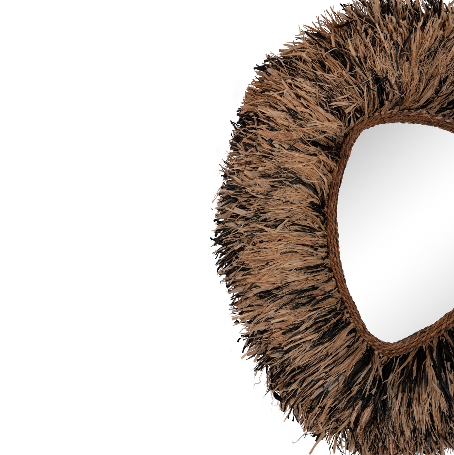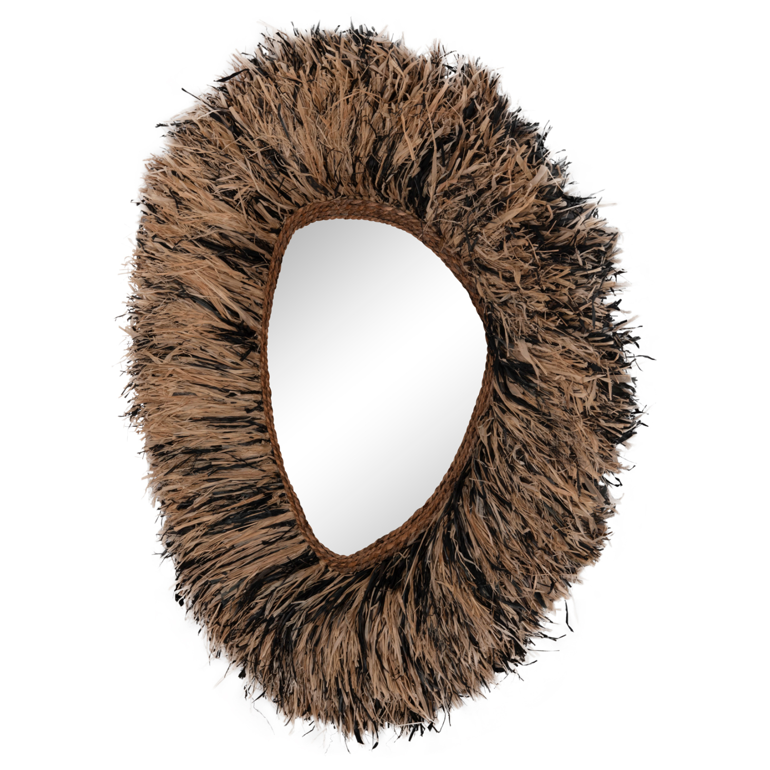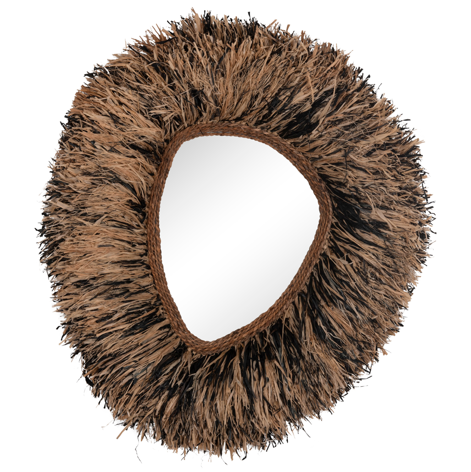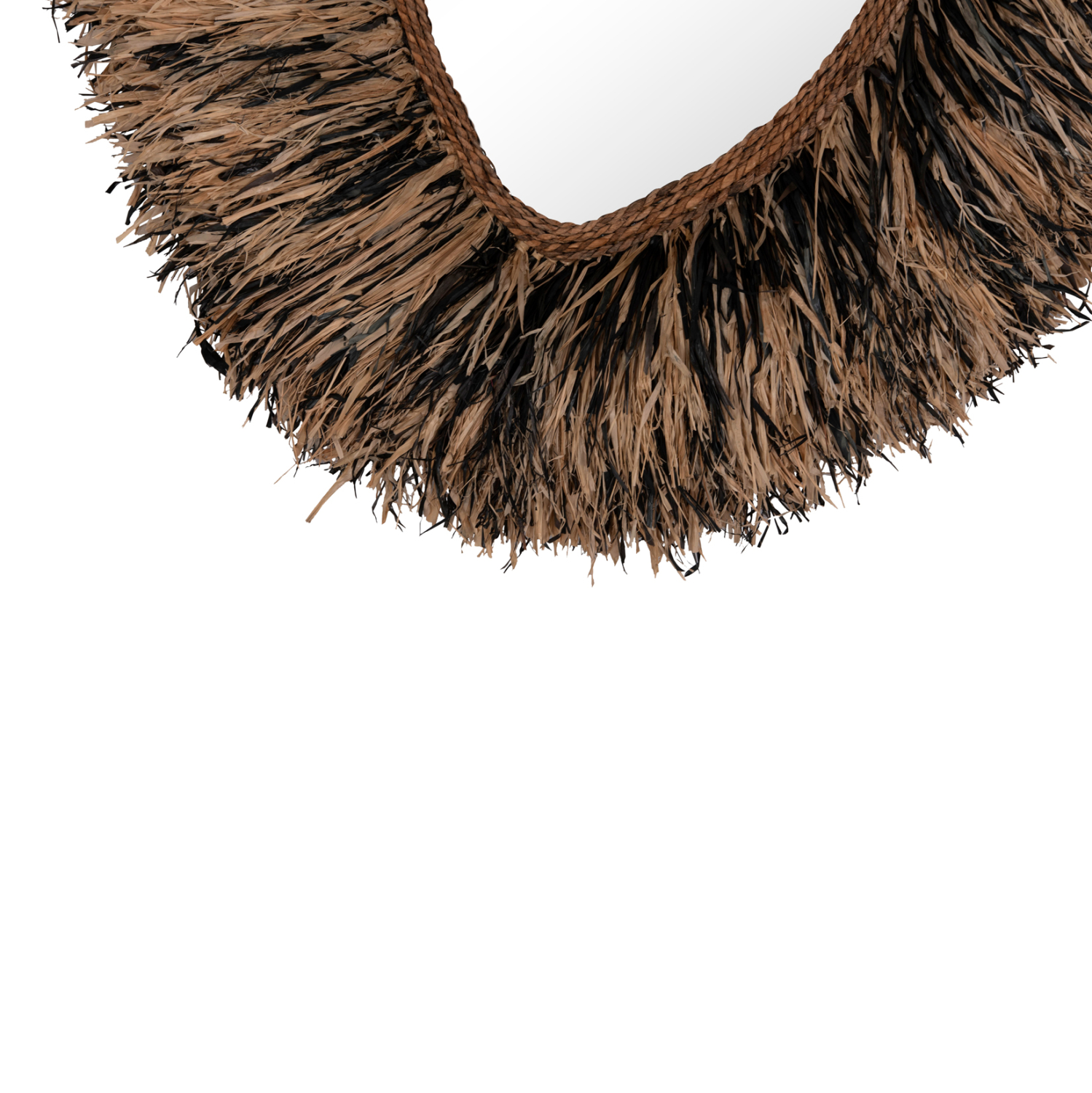 O καθρέπτης GRESSO είναι πραγματικά ένα εντυπωσιακό κομμάτι στην διακόσμηση του χώρου σας! Το design του είναι μοναδικό με το αριστοτεχνικά κατασκευασμένο ακανόνιστο πλαίσιο από ίνες φλοιού μπανάνας, το οποίο στο κέντρο του «φιλοξενεί» τον καθρέπτη. Οι ίνες είναι σε μαύρο και φυσικό χρώμα και ο καθρέπτης αποτελεί ένα χαρακτηριστικό δείγμα boho αισθητικής και διακόσμησης. Είναι ιδανικός τόσο για το σπίτι όσο και για επαγγελματικούς χώρους όπως ξενοδοχεία, Airbnb, χώρους εστίασης ως διακοσμητικό στοιχείο κτλ.