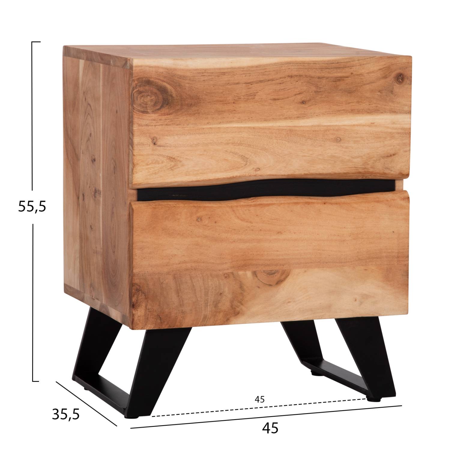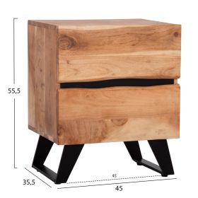 Κομοδίνο από μασίφ ξύλο Ακακίας σε φυσική απόχρωση και μεταλλικά πόδια σε μαύρο χρώμα.