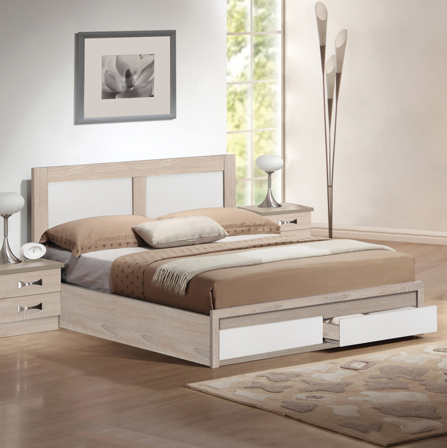 Το κρεβάτι CAPRI σε διάσταση για ημίδιπλο στρώμα 120x200 εκ, είναι μια άριστης ποιότητας, κλασική και ασφαλής επιλογή που θα ταιριάξει σε κάθε υπνοδωμάτιο. Το χαρακτηριστικό του είναι ότι πατάει απευθείας στο δάπεδο και εκμεταλλεύεται τον χώρο κάτω από τις τάβλες του σομιέ με 2 εύχρηστα συρτάρια που βγαίνουν από την πλευρά του «ποδαρικού» (η επιφάνεια απέναντι από το κεφαλάρι). Όλες οι γωνίες είναι τετραγωνισμένες χωρίς καμία καμπύλη, ενώ o sonoma-λευκός χρωματισμός είναι ευχάριστος, και μπορεί να συνδυαστεί με πληθώρα διακοσμητικών μοτίβων στον χώρο σας.