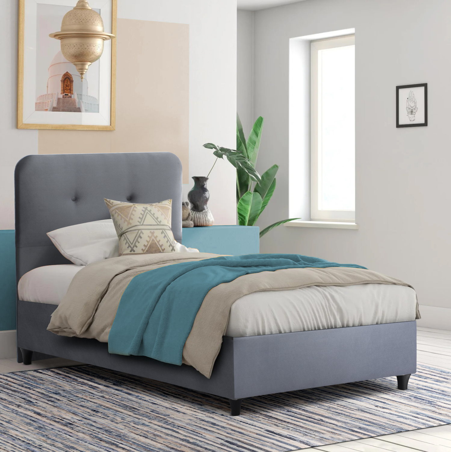 Η επένδυση έχει γίνει εξολοκλήρου από βελούδινο ύφασμα, χαρίζοντας ελκυστική όψη και μια εκλεπτυσμένη γοητεία στην διακόσμηση του υπνοδωματίου. Πρόκειται για ένα ύφασμα απαλό, χαλαρό, απολαυστικό και φινετσάτο που είναι αδύνατον να του αντισταθεί κάποιος. Το θετικό είναι ότι μπορεί να εναρμονιστεί εύκολα με κάθε είδος διακόσμησης, προσδίδοντας στο χώρο φινέτσα και καλαισθησία.