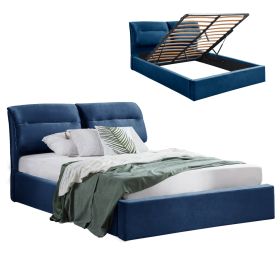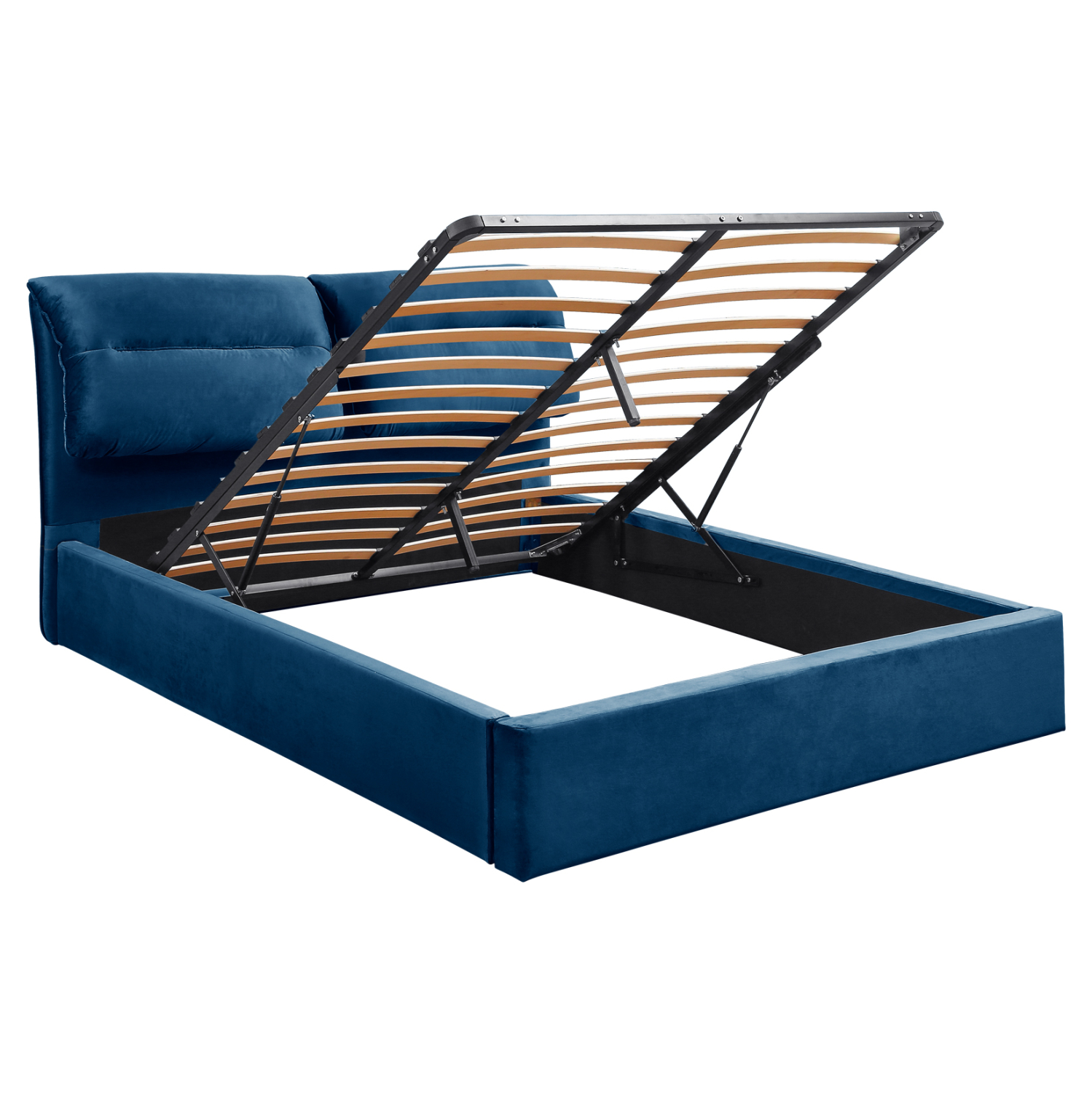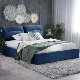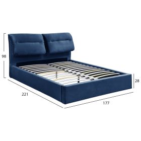 Σε διάσταση για στρώμα 160x200 εκ, είναι επαρκέστατα άνετο για να χωρέσουν δύο άτομα. Έχει κεφαλάρι με δύο μαξιλάρια δεμένα πάνω του (αποσπώμενα με φερμουάρ) για να προσφέρει άνεση όταν κάθεστε για να διαβάσετε το βιβλίο σας, ενώ ολόκληρη η επένδυσή του έχει γίνει με εξαιρετικής ποιότητας βελούδινο ύφασμα σε ΜΠΛΕ χρώμα. Το στρώμα «κάθεται» πάνω σε δύο σειρές από ανατομικές τάβλες, ακολουθώντας τον παραδοσιακό τρόπο κατασκευής κρεβατιού. Επιπλέον, το τελάρο με τις τάβλες στήριξης του στρώματος ανασηκώνεται (αφού πρώτα αφαιρέσετε το στρώμα) με μεταλλικό μηχανισμό ασφαλείας προσφέροντας έναν μεγάλο αποθηκευτικό χώρο, ο οποίος φυσικά καταλαμβάνει όλο τον χώρο μέχρι το δάπεδο.