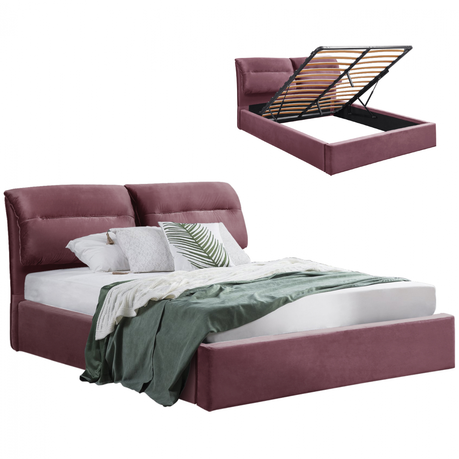 Σε διάσταση για στρώμα 160x200 εκ, είναι επαρκέστατα άνετο για να χωρέσουν δύο άτομα. Έχει κεφαλάρι με δύο μαξιλάρια δεμένα πάνω του (αποσπώμενα με φερμουάρ) για να προσφέρει άνεση όταν κάθεστε για να διαβάσετε το βιβλίο σας, ενώ ολόκληρη η επένδυσή του έχει γίνει με εξαιρετικής ποιότητας βελούδινο ύφασμα σε ΣΑΠΙΟ ΜΗΛΟ χρώμα. Το στρώμα «κάθεται» πάνω σε δύο σειρές από ανατομικές τάβλες, ακολουθώντας τον παραδοσιακό τρόπο κατασκευής κρεβατιού. Επιπλέον, το τελάρο με τις τάβλες στήριξης του στρώματος ανασηκώνεται με μεταλλικό μηχανισμό ασφαλείας με 2 αμορτισέρ προσφέροντας έναν μεγάλο αποθηκευτικό χώρο, ο οποίος φυσικά καταλαμβάνει όλο τον χώρο μέχρι το δάπεδο.