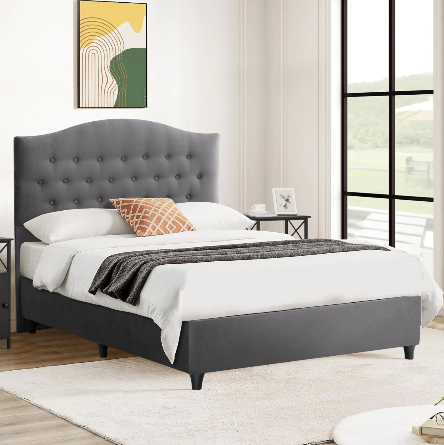 Το κρεβάτι MALENA έχει ψηλό κεφαλάρι, επενδυμένο με καπιτονέ τεχνοτροπία με τρούκς, ενώ και όλη η επένδυση του κρεβατιού είναι από βελούδινο ύφασμα.