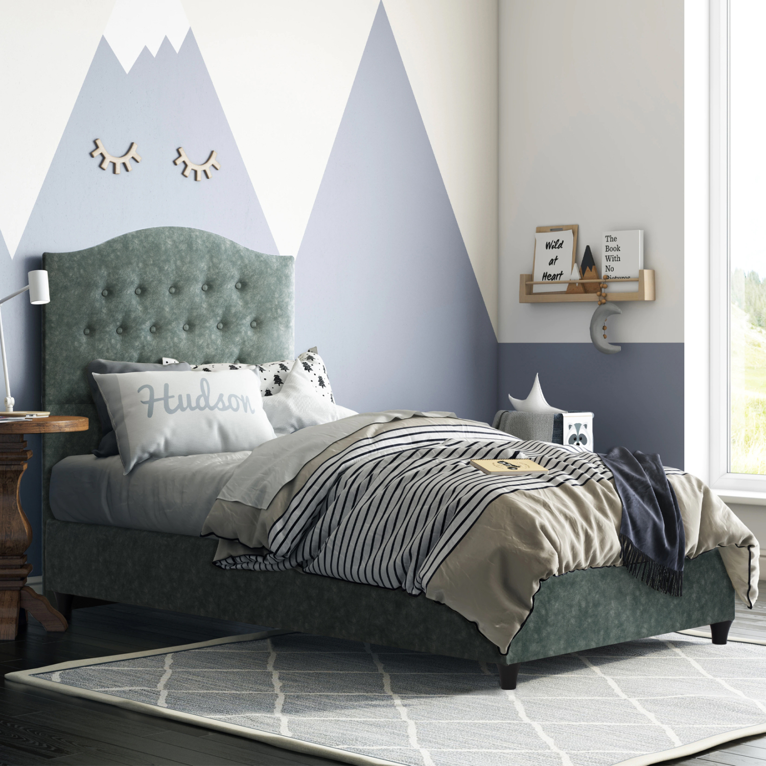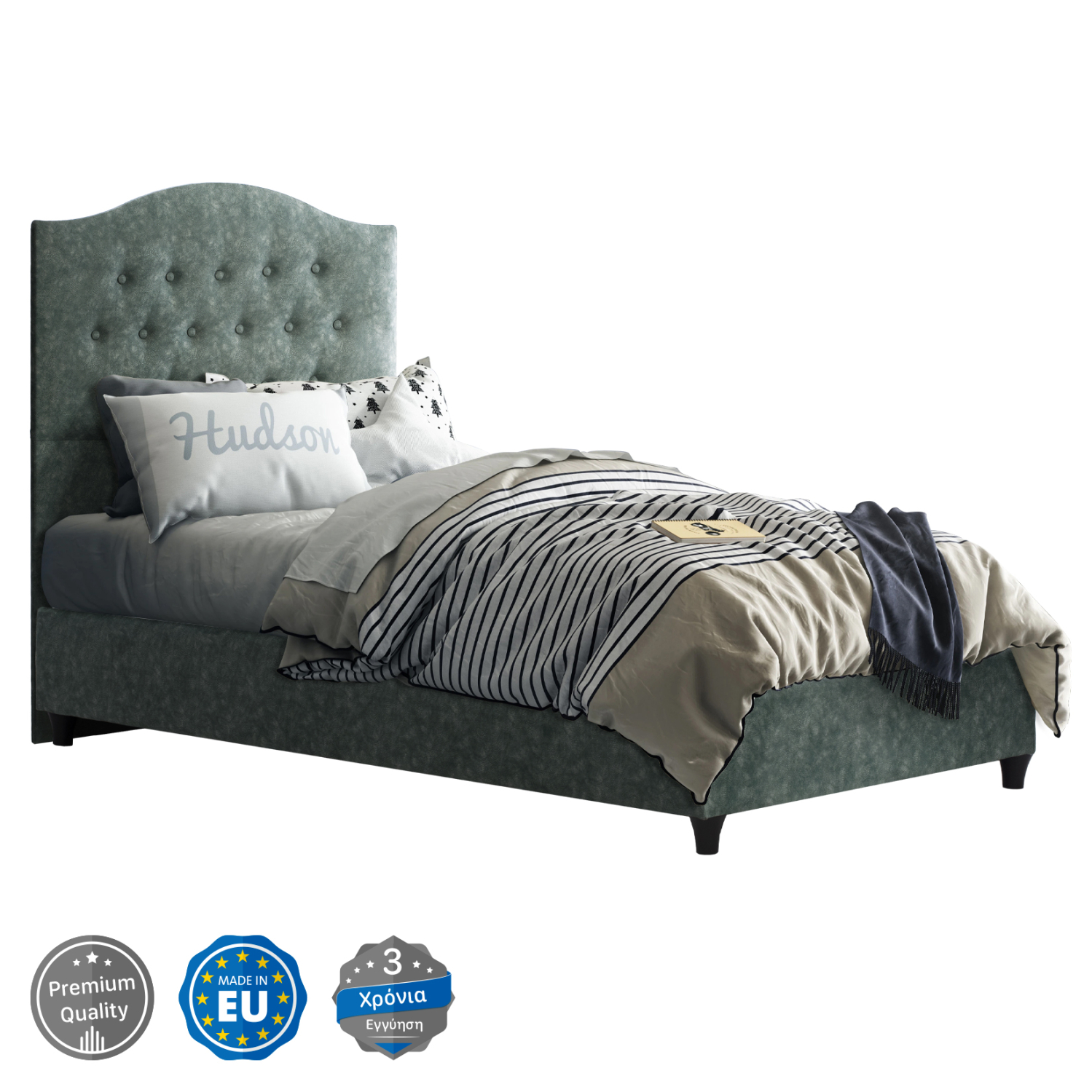 Το κρεβάτι MALENA έχει ψηλό κεφαλάρι, επενδυμένο με καπιτονέ τεχνοτροπία με τρούκς, ενώ και όλη η επένδυση του κρεβατιού είναι από τύπου-NUBUCK ύφασμα. Το ΠΡΑΣΙΝΟ χρώμα σε όλο το κρεβάτι είναι όμορφο και μπορεί να συνδυαστεί με πληθώρα διακοσμητικών μοτίβων.