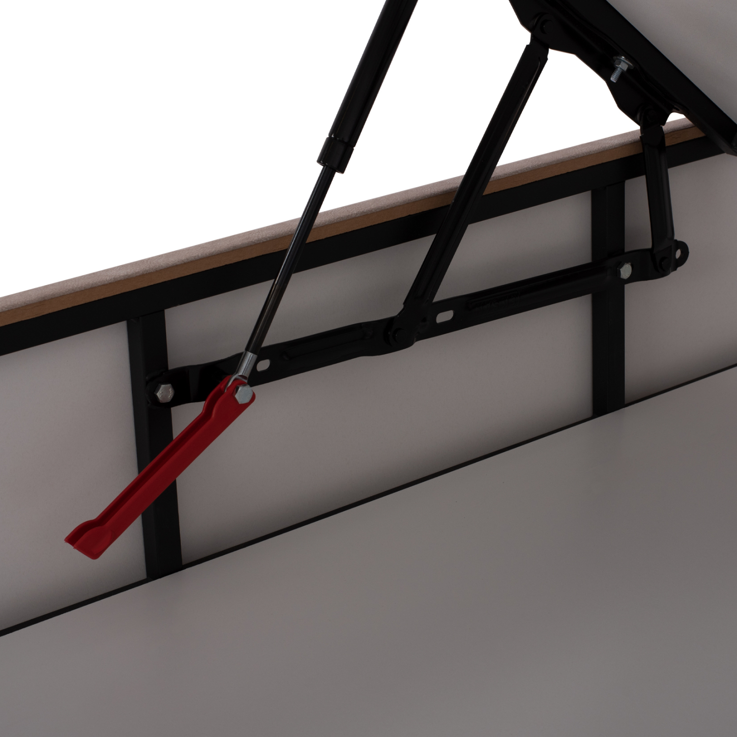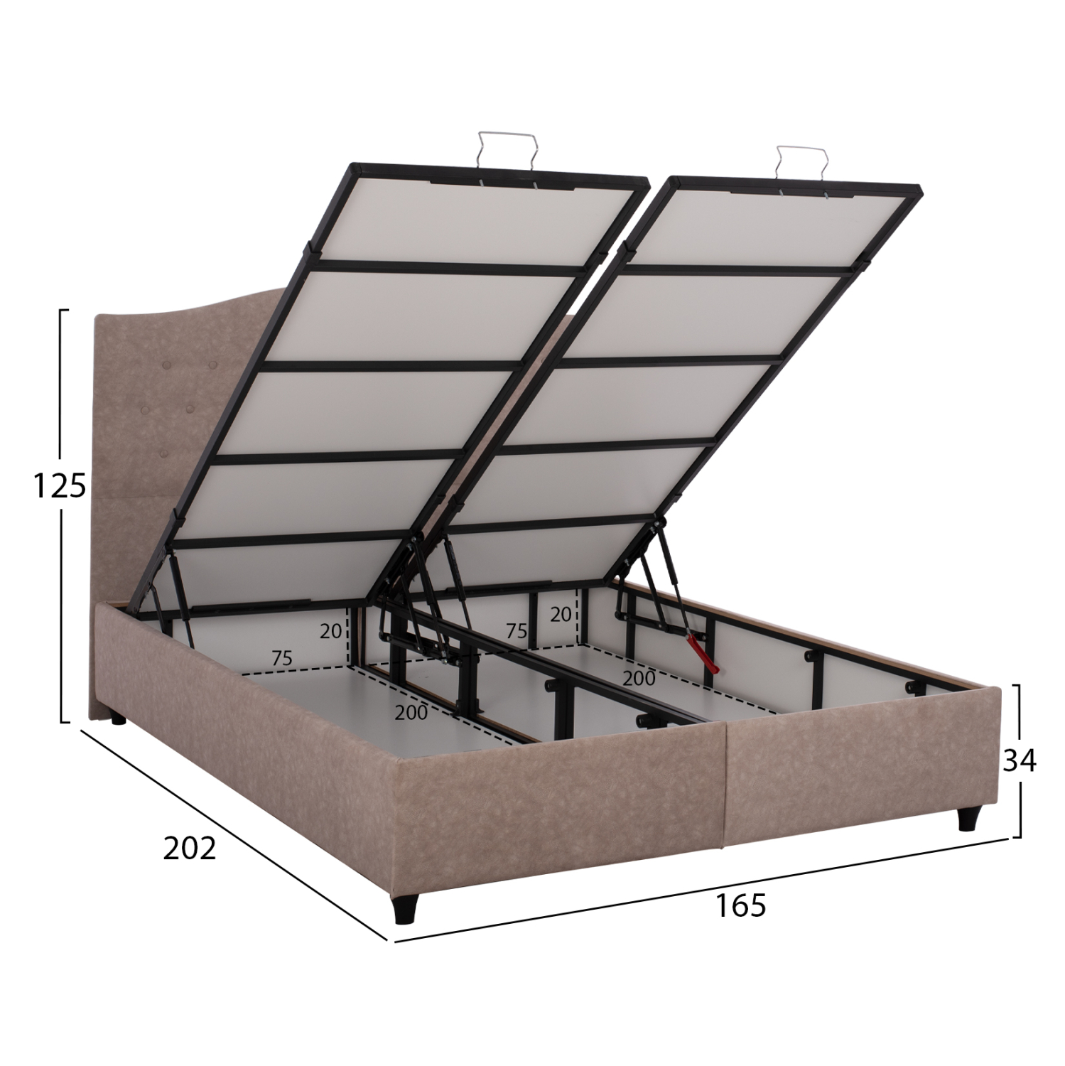 Όμως, το κύριο χαρακτηριστικό αυτού του κρεβατιού είναι ότι δεν ακολουθεί την κλασική κατασκευή με τις τάβλες του σομιέ για την στήριξη του στρώματος, αλλά αντίθετα αποτελείται από μια συνεχόμενη επιφάνεια (2 μοριοσανίδες) επενδυμένη με αντιολισθητική φόδρα, πάνω στην οποία τοποθετείται το στρώμα. Επιπλέον, η κάθε επιφάνεια από μοριοσανίδα ανασηκώνεται με μεταλλικό μηχανισμό ασφαλείας με 4 αμορτισέρ και μεταλλικές λαβές προσφέροντας έναν μεγάλο αποθηκευτικό χώρο. Σε διαστάσεις διπλού στρώματος 160x200 εκ. θα μπορέσει να φιλοξενήσει «βασιλικά» 2 άτομα.