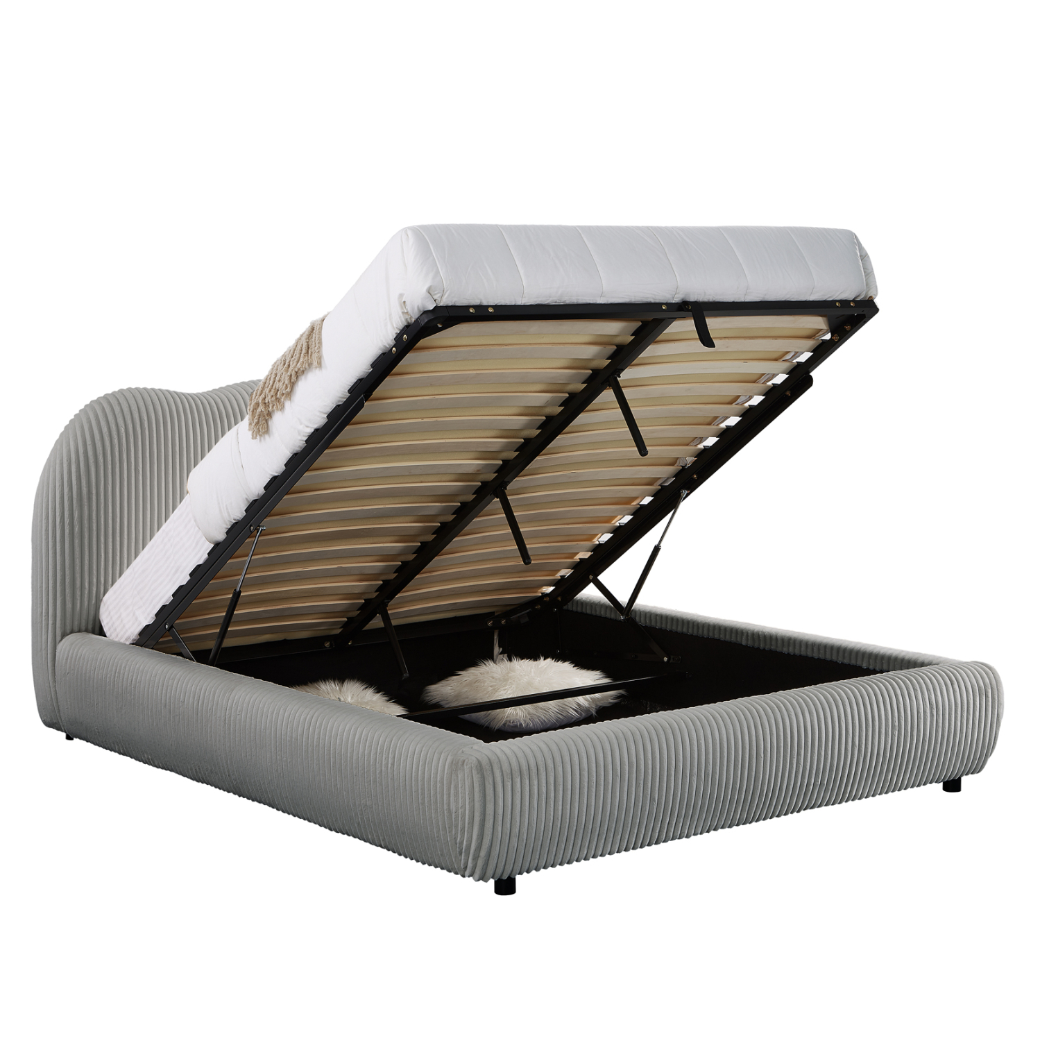 Το στρώμα «κάθεται» πάνω σε δύο σειρές από ανατομικές τάβλες. Επιπλέον, το μεταλλικό τελάρο με τις τάβλες στήριξης του στρώματος ανασηκώνεται με μεταλλικό μηχανισμό ασφαλείας με αμορτισέρ που κρατάει το τελάρο ανασηκωμένο για όσο χρόνο χρειάζεται, προσφέροντας έναν μεγάλο αποθηκευτικό χώρο, ο οποίος φυσικά καταλαμβάνει όλο τον χώρο μέχρι το δάπεδο. Τα πόδια είναι χαμηλά από ενισχυμένο πολυαιθυλένιο.