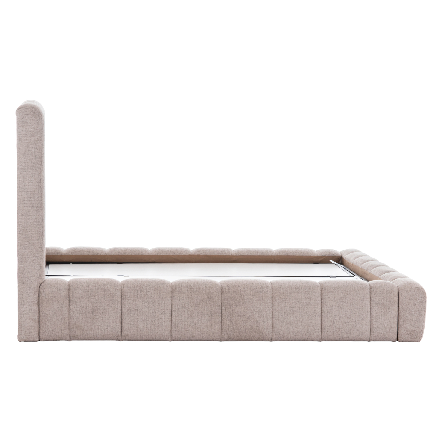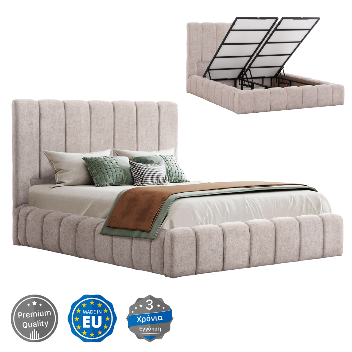 Το REMO είναι ένα κρεβάτι που θα αγαπήσετε με την πρώτη ματιά! Το κεφαλάρι είναι ψηλό με τεχνοτροπία καπιτονέ με κάθετες ραφές από «ζεστό» και εντυπωσιακό ύφασμα TEDDY σε ΜΠΕΖ χρώμα. Τα πλαϊνά του κρεβατιού αλλά και το ποδαρικό είναι ίδιας αισθητικής με το κεφαλάρι και «αγκαλιάζουν» το στρώμα! Όμως, το κύριο χαρακτηριστικό αυτού του κρεβατιού είναι ότι δεν ακολουθεί την κλασική κατασκευή με τις τάβλες του σομιέ για την στήριξη του στρώματος, αλλά αντίθετα αποτελείται από μια συνεχόμενη επιφάνεια (2 μοριοσανίδες), πάνω στις οποίες τοποθετείται το στρώμα! Επιπλέον, η κάθε επιφάνεια από μοριοσανίδα ανασηκώνεται με μεταλλικό μηχανισμό ασφαλείας με 4 αμορτισέρ και διαφανείς πλαστικές λαβές προσφέροντας έναν μεγάλο αποθηκευτικό χώρο. Σε διπλή διάσταση στρώματος 160x200 εκ. θα χωρέσει κάθε σας όνειρο!