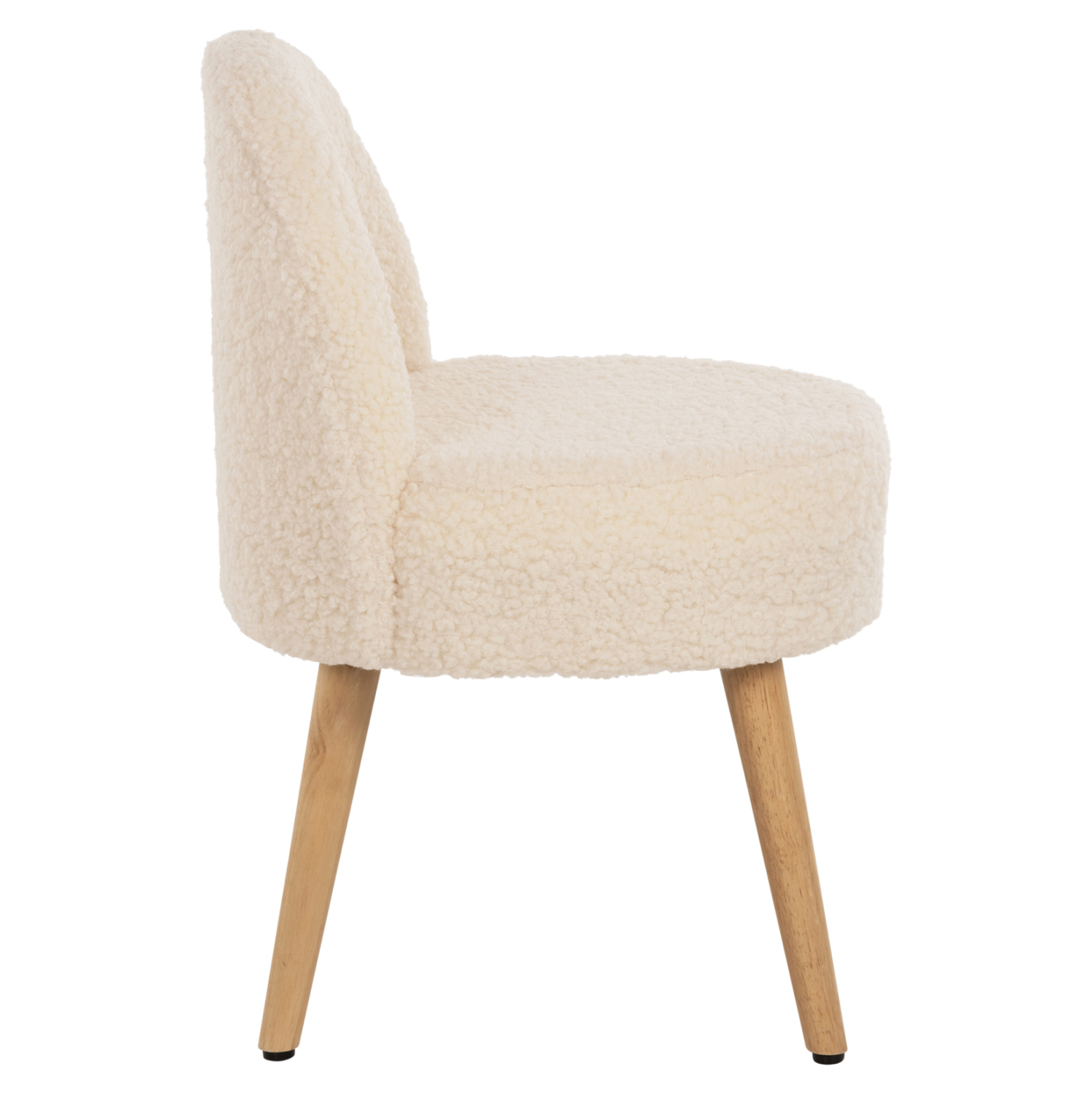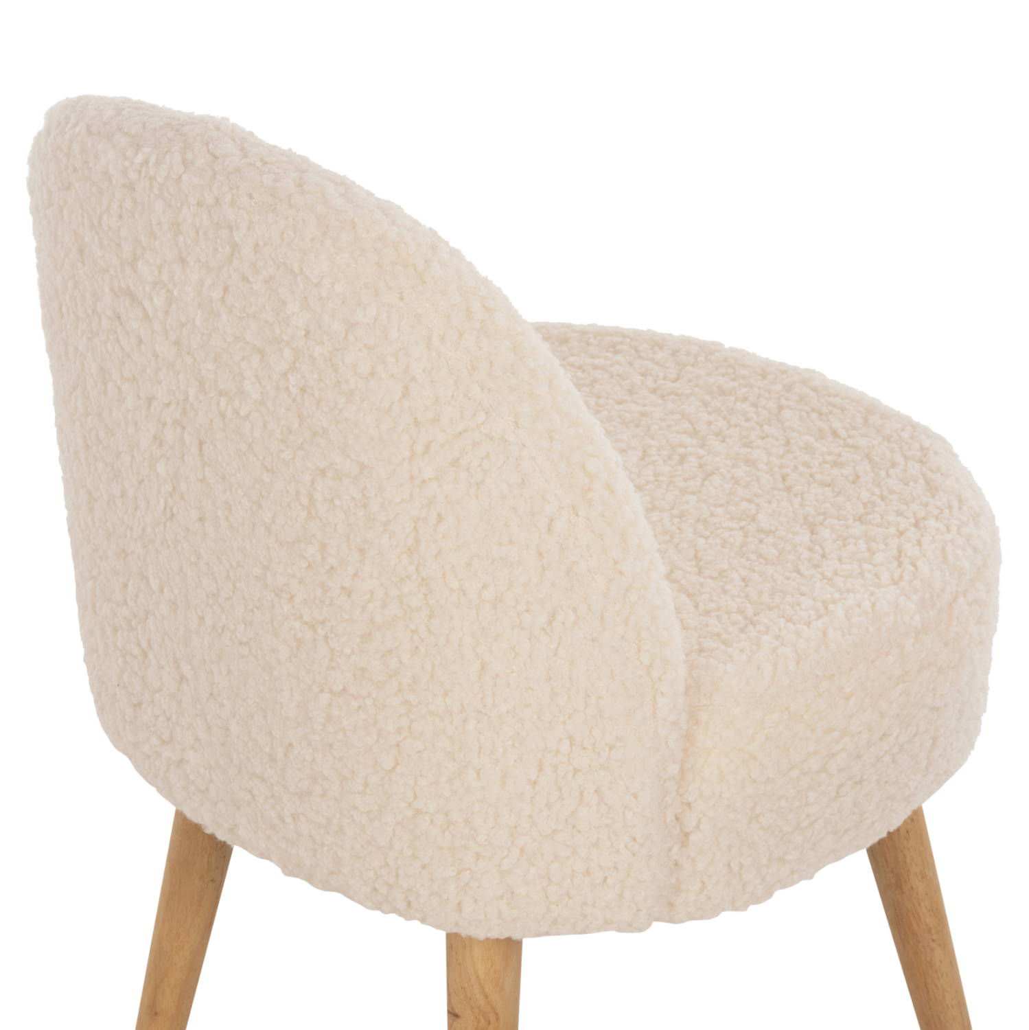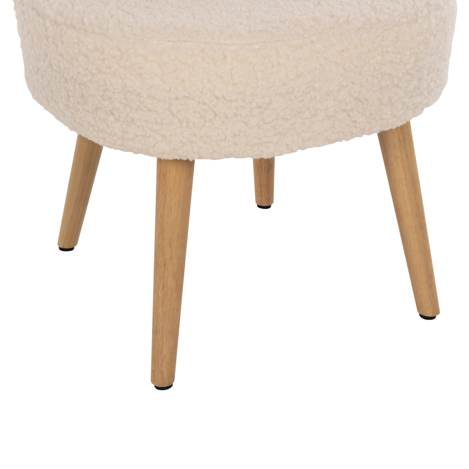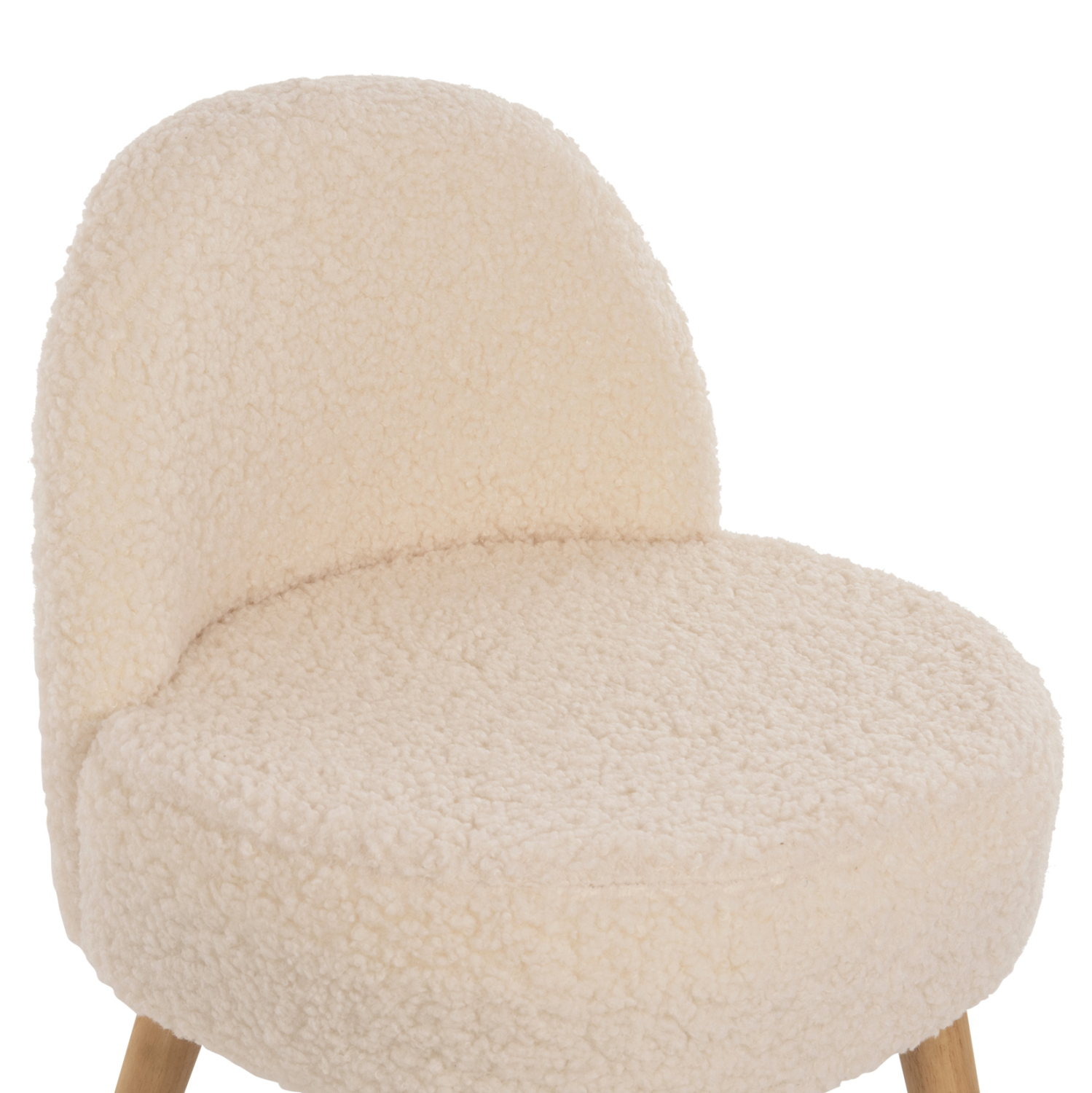 Σκαμπό με πολύ χαμηλή πλάτη YASMINE με επένδυση από ζεστό μπουκλέ ύφασμα σε ΛΕΥΚΗ απόχρωση, με ξύλινα πόδια σε φυσική απόχρωση.