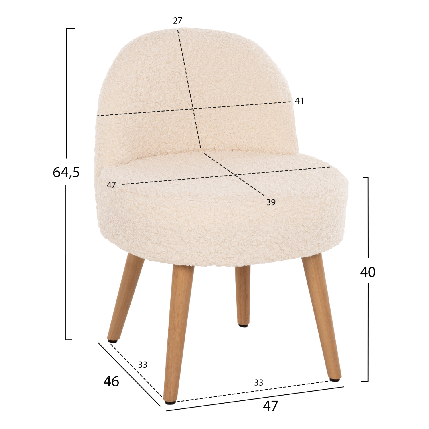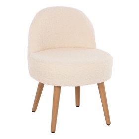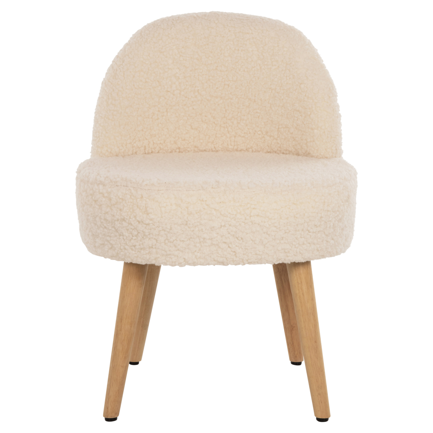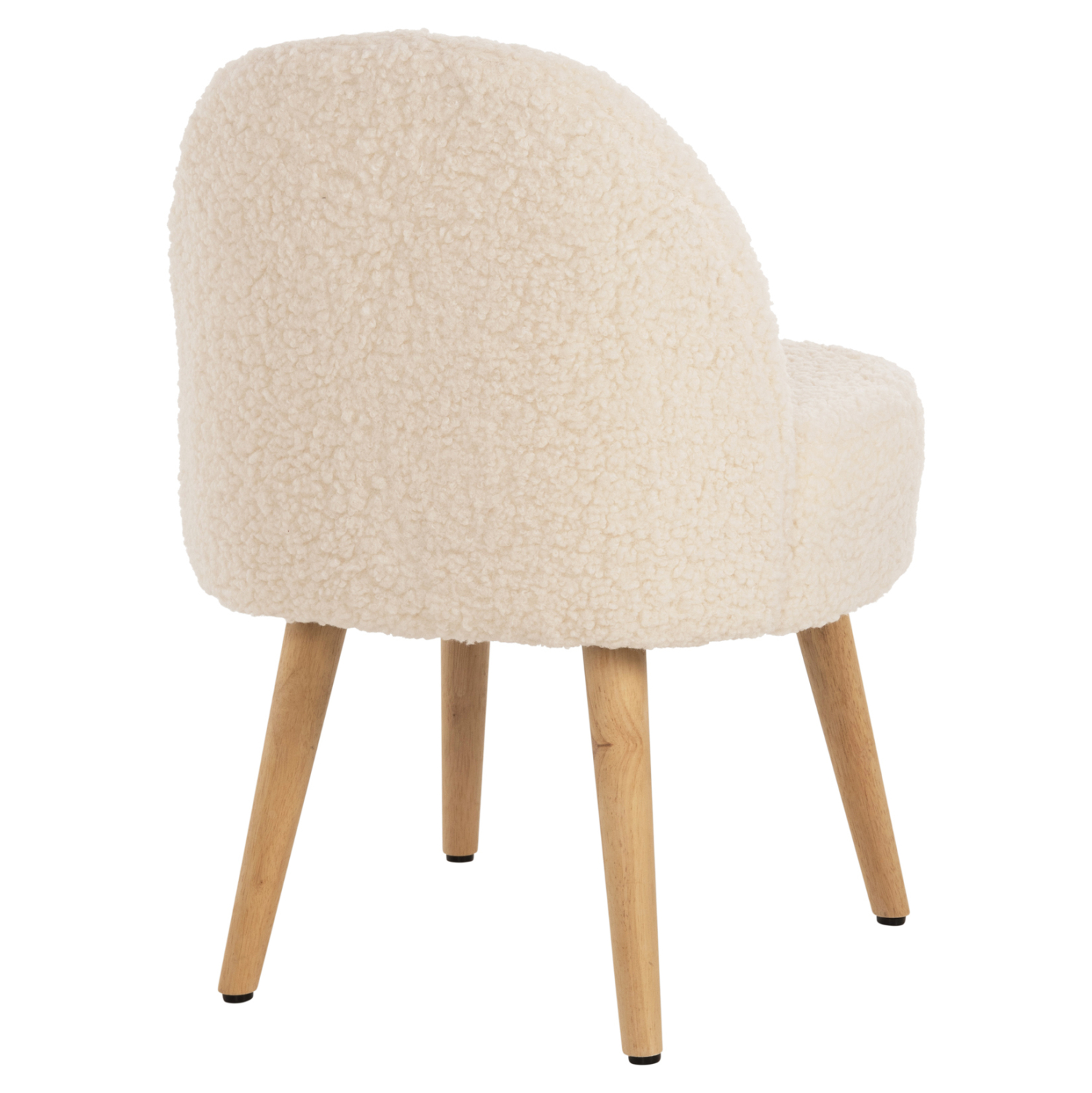 Σκαμπό με πολύ χαμηλή πλάτη YASMINE με επένδυση από ζεστό μπουκλέ ύφασμα σε ΛΕΥΚΗ απόχρωση, με ξύλινα πόδια σε φυσική απόχρωση.
