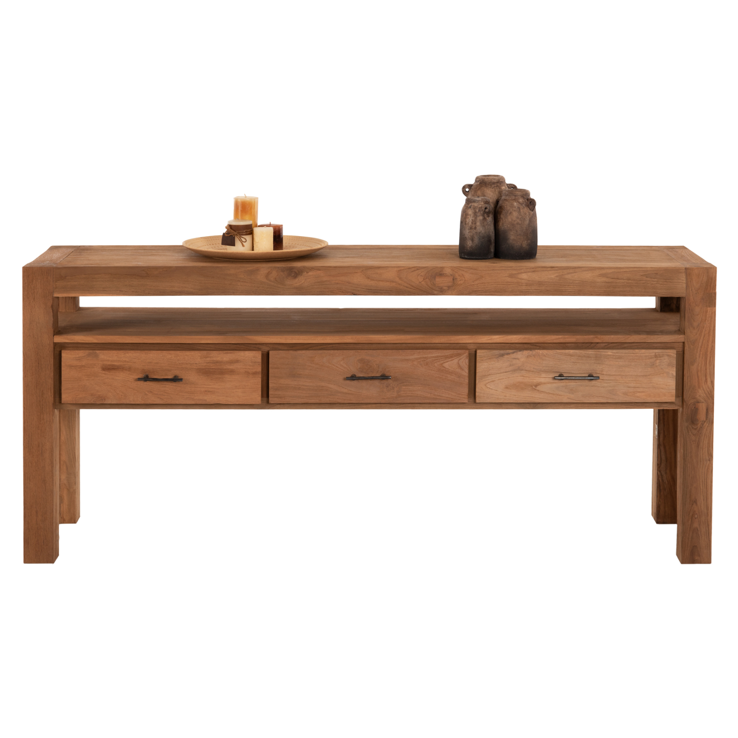 HM9556---Κονσόλα από ξύλο ΤΕΑΚ σε κανονικό μακρόστενο ορθογώνιο σχήμα επιφάνειας. Στηρίζεται σε 4 στιβαρά πόδια και διαθέτει 3 συρτάρια σε σειρά. Πάνω από τα συρτάρια διαθέτει και επιπλέον χώρο τοποθέτησης αντικειμένων. Το ΦΥΣΙΚΟ χρώμα όλου του επίπλου προσδίδει μια ακαταμάχητη εικόνα που θα αποτελέσει το σημείο αναφοράς οπουδήποτε κι αν τοποθετηθεί η κονσόλα! Αποτελεί την επιτομή της ρουστίκ διακόσμησης σε λιτή κι απέριττη υλοποίηση, για τον χώρο που επιθυμείτε. Τι είναι όμως η κονσόλα; Η κονσόλα είναι ένα κομψό, γραφικό, συμπαγές έπιπλο που μπορεί να τοποθετηθεί σε σχεδόν οποιοδήποτε δωμάτιο- κουζίνα, διάδρομο, κρεβατοκάμαρα, παιδικό δωμάτιο, σαλόνι, dressing room, γραφείο, ακόμα και στο μπάνιο. Με αυτό, ο σχεδιασμός του χώρου γίνεται εκλεπτυσμένος, κομψός, πλήρως σκεπτόμενος. Η κονσόλα στο εσωτερικό χρησιμοποιείται τόσο ως μέρος ενός σετ με πολλά στοιχεία, όσο και ανεξάρτητα και επιλέγεται για τον γενικό σχεδιασμό του δωματίου.