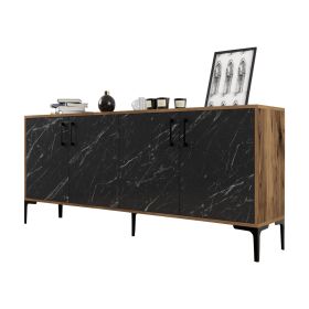 Ο μπουφές ΗΜ9428.03 είναι ένα επιβλητικό έπιπλο όπου κι αν τον τοποθετήσετε. Έχει ψηλά μαύρα μεταλλικά πόδια και δύο μεγάλα ντουλάπια με ράφι, που ανοίγουν με διπλές πόρτες. Το μήκος του εξασφαλίζει ότι η επιφάνεια του είναι μεγάλη και αρκετή για τοποθέτηση πολλών αντικειμένων. Το χρώμα όλης της κατασκευής είναι καρυδί, ενώ όλες οι πόρτες έχουν εφέ μαύρου μαρμάρου. Ο μπουφές αυτός θα σας ενθουσιάσει! Τι είναι όμως ο μπουφές; Ο μπουφές είναι ένα άκρως πρακτικό έπιπλο, αφού στους αποθηκευτικούς του χώρους μπορούμε να βάλουμε από σερβίτσια πιάτων και ποτήρια, μέχρι κεριά και διάφορα άλλα χρηστικά αντικείμενα που έχουμε στο σπίτι μας, ώστε να είναι τακτοποιημένα και να μη δημιουργούν ακαταστασία στο χώρο.