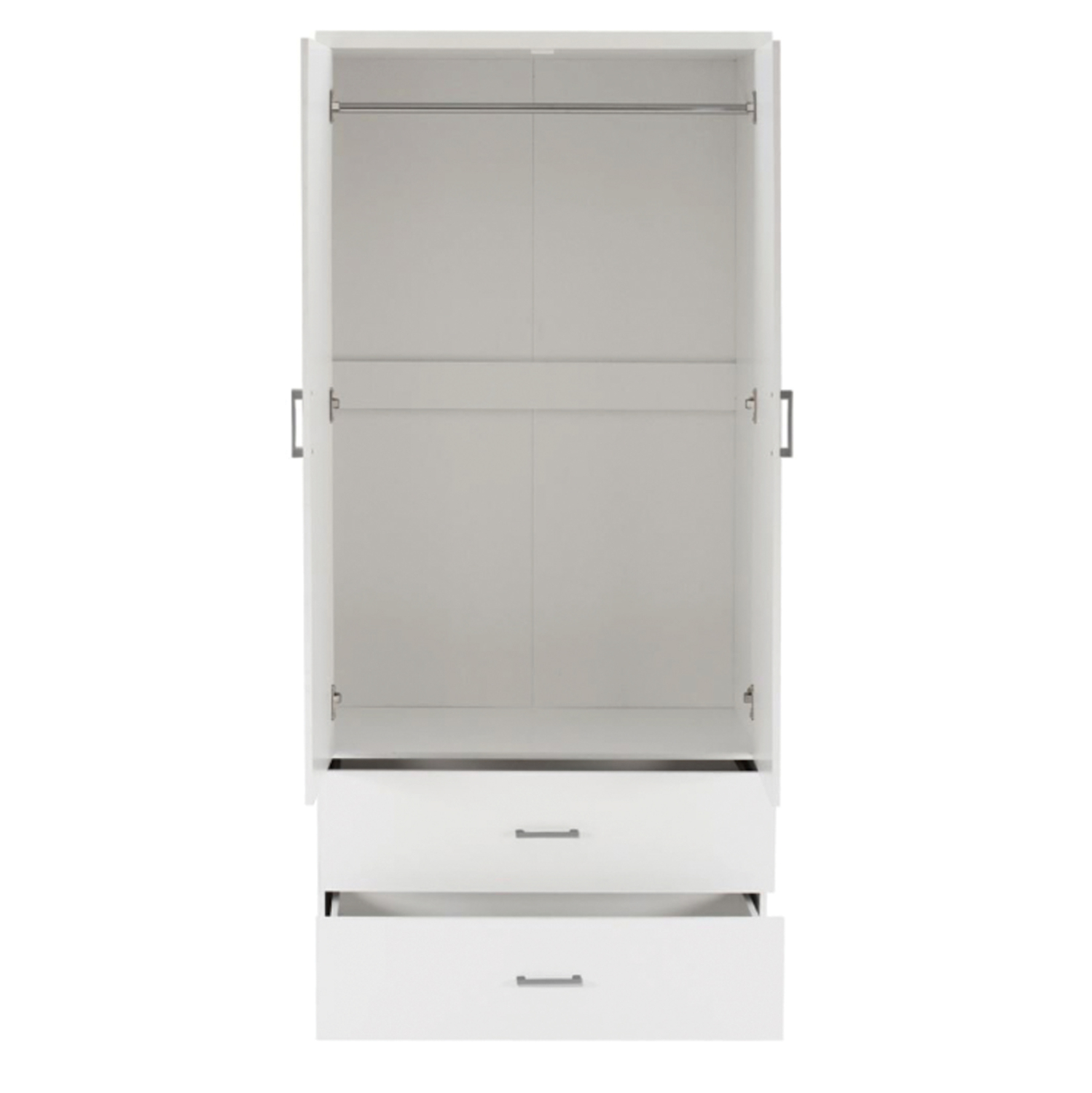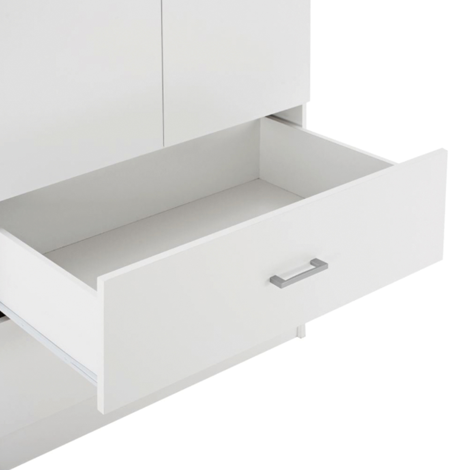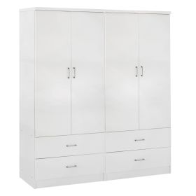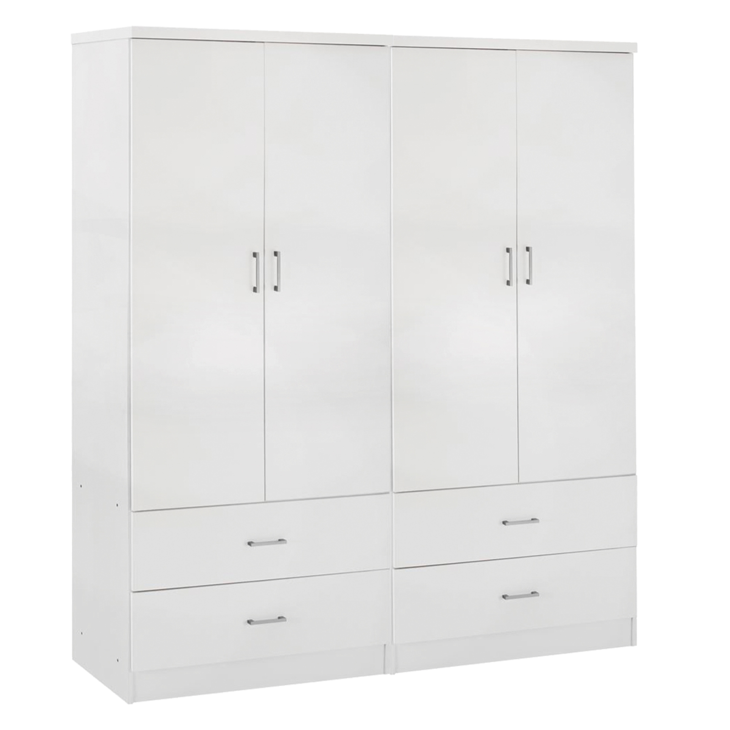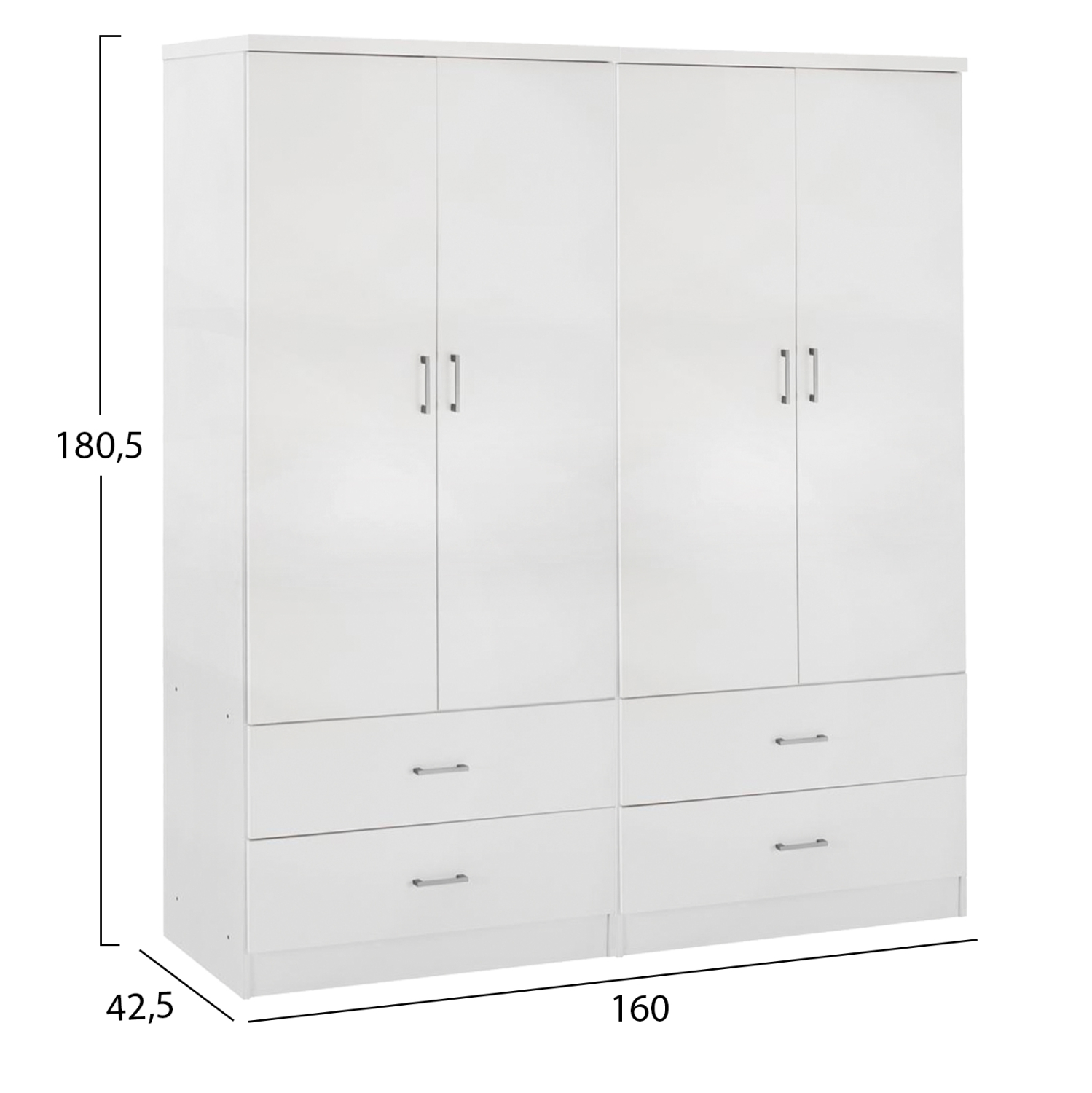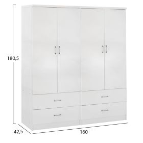 Γνωρίστε την 4-φυλλη ντουλάπα-γκαρνταρόμπα REINA (2 δίφυλλες). Πρόκειται για μια μεγάλη ντουλάπα με 4 πόρτες, και στο εσωτερικό της υπάρχει μόνο μια INOX μπάρα για κρέμαση ρούχων. Κάτω ακριβώς από τον χώρο της γκαρνταρόμπας υπάρχουν και 4 ευρύχωρα συρτάρια. Οι πόρτες αλλά και τα συρτάρια ανοίγουν με καλαίσθητα ασημί χερούλια. Είναι κατασκευασμένη από μελαμίνη σε ΛΕΥΚΟ χρώμα και αισθητικά μπορεί να ταιριάξει με πολλά άλλα στυλ, χάρη και στις «καθαρές» γραμμές της.