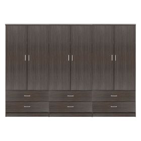 Γνωρίστε την 6-φυλλη (3 δίφυλλες) ντουλάπα-γκαρνταρόμπα REINA. Πρόκειται για μια μεγάλη ντουλάπα με 6 πόρτες, και στο εσωτερικό της υπάρχει μόνο μια INOX μπάρα για κρέμαση ρούχων. Κάτω ακριβώς από τον χώρο της γκαρνταρόμπας υπάρχουν και 6 ευρύχωρα συρτάρια. Οι πόρτες αλλά και τα συρτάρια ανοίγουν με καλαίσθητα ασημί χερούλια. Είναι κατασκευασμένη από μελαμίνη σε ZEBRANO χρώμα και αισθητικά μπορεί να ταιριάξει με πολλά άλλα στυλ, χάρη και στις «καθαρές» γραμμές της.