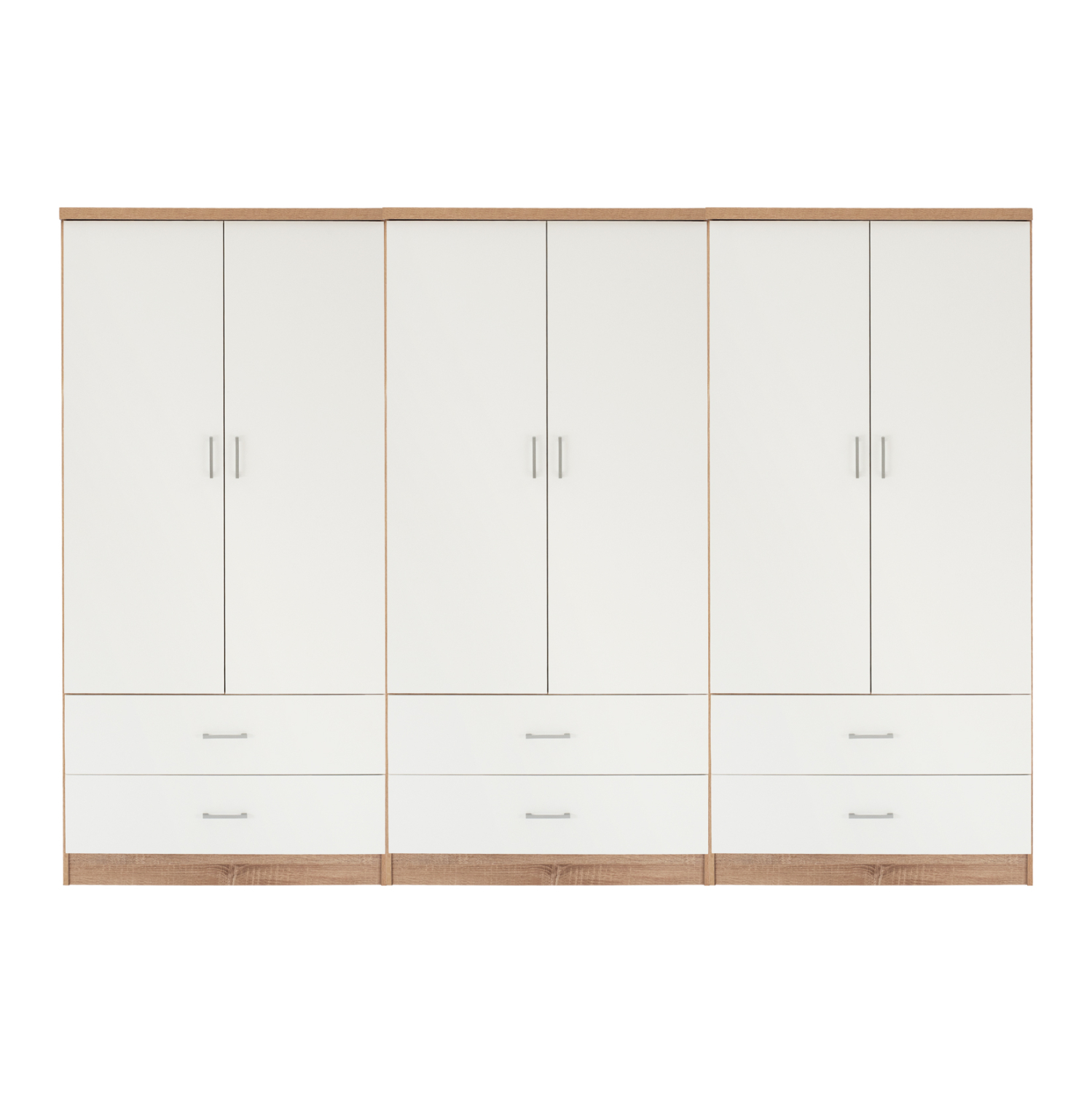 Γνωρίστε την 6-φυλλη (3 δίφυλλες) ντουλάπα-γκαρνταρόμπα REINA. Πρόκειται για μια μεγάλη ντουλάπα με 6 πόρτες, και στο εσωτερικό της υπάρχει μόνο μια INOX μπάρα για κρέμαση ρούχων. Κάτω ακριβώς από τον χώρο της γκαρνταρόμπας υπάρχουν και 6 ευρύχωρα συρτάρια. Οι πόρτες αλλά και τα συρτάρια ανοίγουν με καλαίσθητα ασημί χερούλια. Είναι κατασκευασμένη από μελαμίνη σε ΛΕΥΚΟ-SONAMA χρώμα και αισθητικά μπορεί να ταιριάξει με πολλά άλλα στυλ, χάρη και στις «καθαρές» γραμμές της.