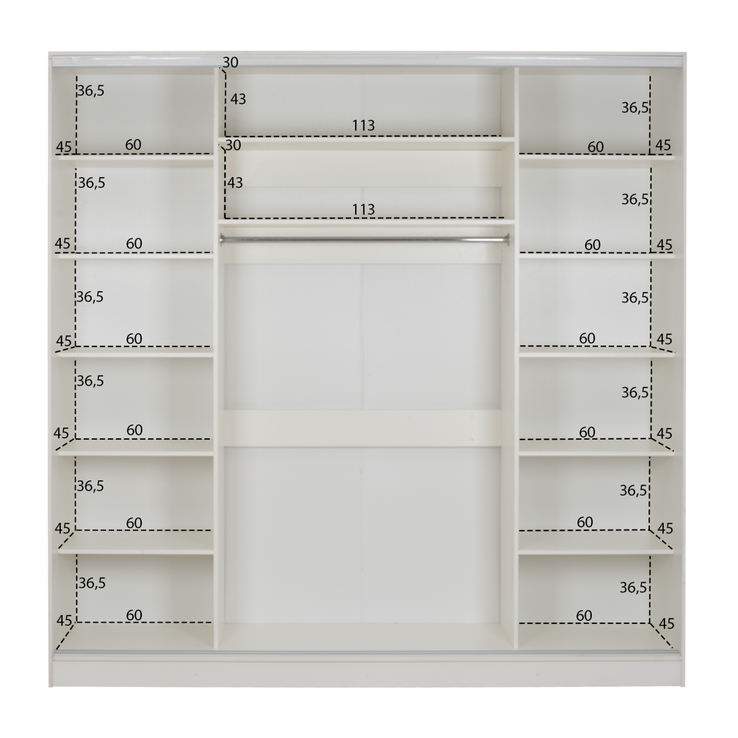 Η ντουλάπα υπνοδωματίου διαθέτει λιτό σχέδιο και το εσωτερικό της περιλαμβάνει στις δύο άκρες, δεξιά και αριστερά, ράφια,που δημιουργούν 6 ευρύχωρα ράφια για αποθήκευση.