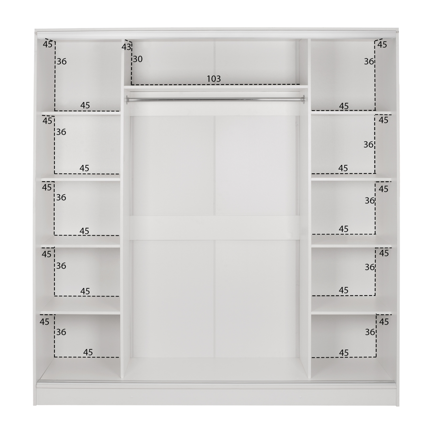 Η ντουλάπα υπνοδωματίου διαθέτει λιτό σχέδιο και το εσωτερικό της περιλαμβάνει στις δύο άκρες, δεξιά και αριστερά, ράφια,που δημιουργούν 5 ευρύχωρα ράφια για αποθήκευση.