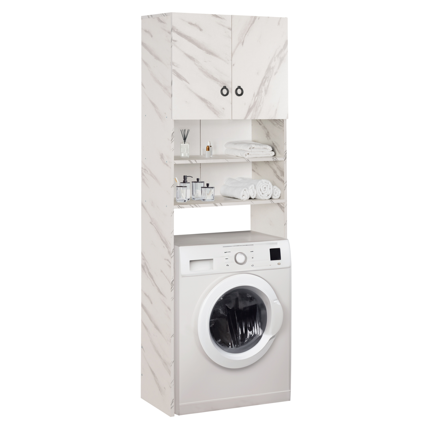 Σας παρουσιάζουμε το καινούριο έπιπλο για το πλυντήριο TERRY. Κατασκευασμένο από μελαμίνη σε όμορφο ΛΕΥΚΟ ΜΑΡΜΑΡΟ χρώμα, αποτελείται από ένα δίφυλλο ντουλάπι στο επάνω μέρος και 2 ανοιχτά ράφια στην μέση.