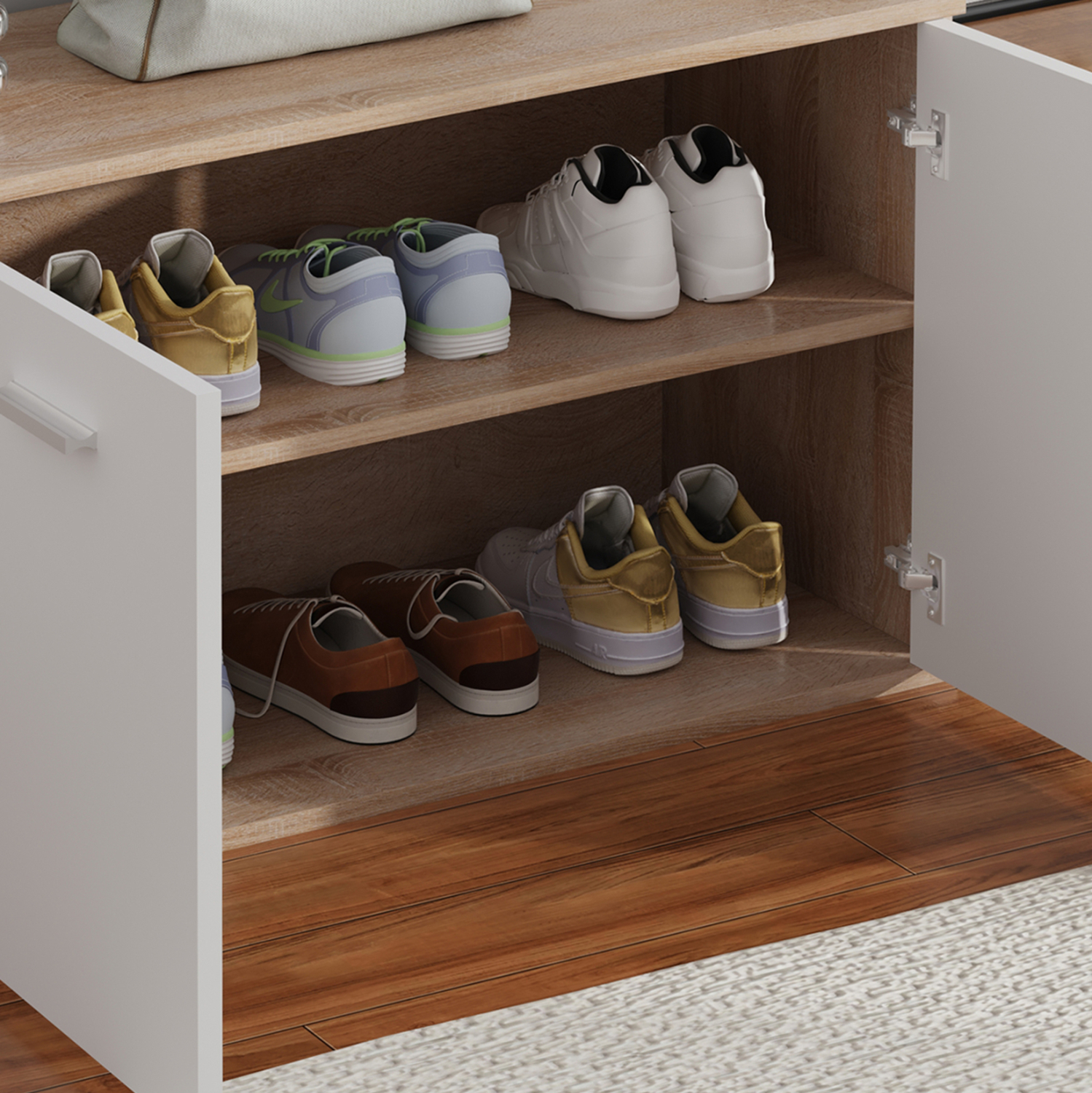 Σας παρουσιάζουμε την παπουτσοθήκη μελαμίνης DIONNE σε SONAMA και ΛΕΥΚΟ χρώμα. Ένα έπιπλο με κλασικό σχεδιασμό ντουλαπιού, που διαθέτει ένα ράφι που δημιουργεί 2 χώρους τοποθέτησης παπουτσιών και κλείνει με δύο πόρτες με όμορφα ασημί χερούλια. Σκοπός μας είναι να σας βοηθήσουμε να οργανώσετε και να βελτιώσετε με τον καλύτερο δυνατό τρόπο την λειτουργικότητα του σπιτιού σας.