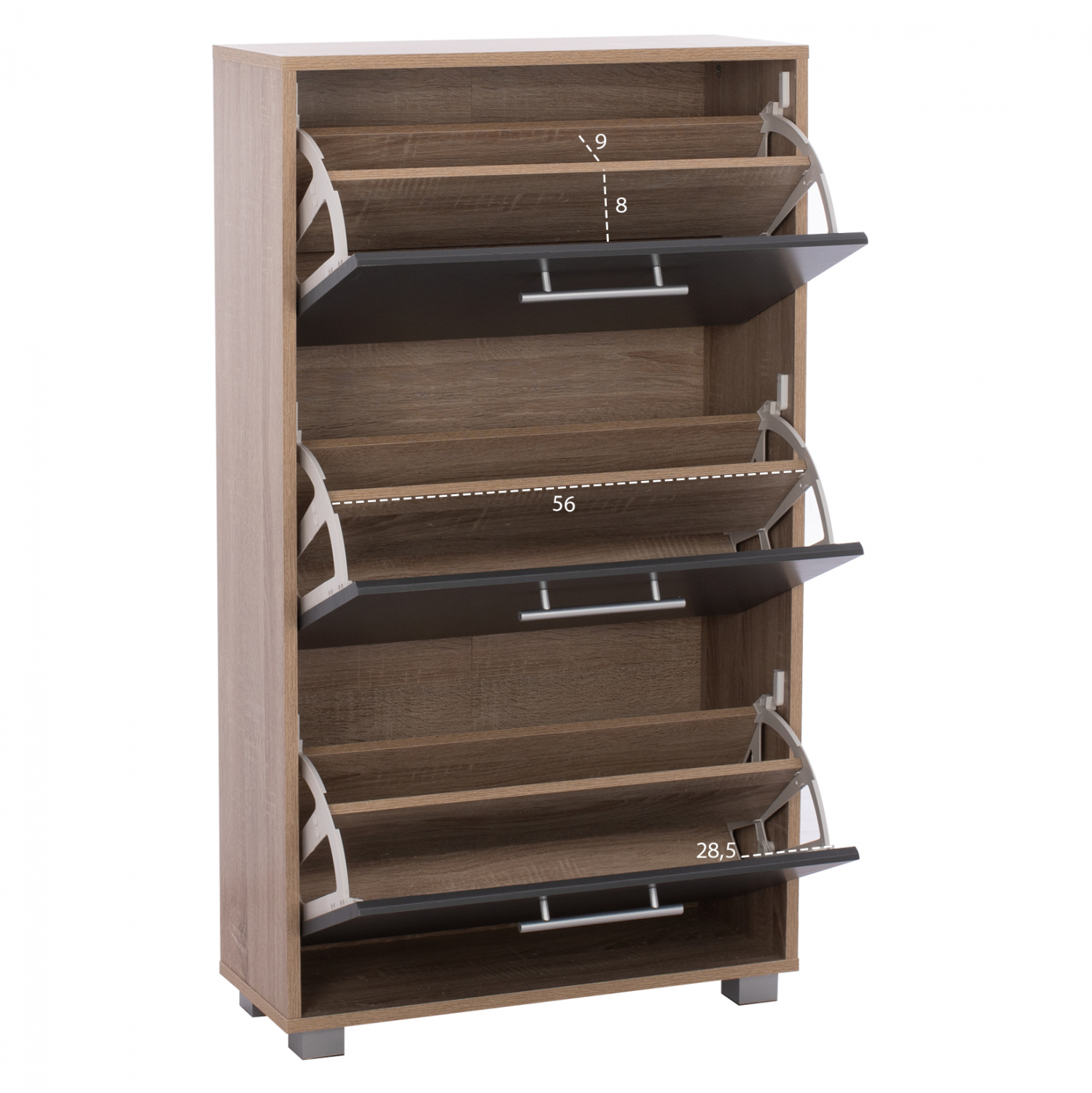 Διαθέτει τρια ανακλινόμενα ντουλάπια που χωράνε 18-21 ζευγάρια παπούτσια, κάθε ντουλάπι διαθέτει εσωτερικά ένα ράφι, δημιουργώντας δύο ράφια για τοποθέτηση παπουτσιών σε κάθε πόρτα.