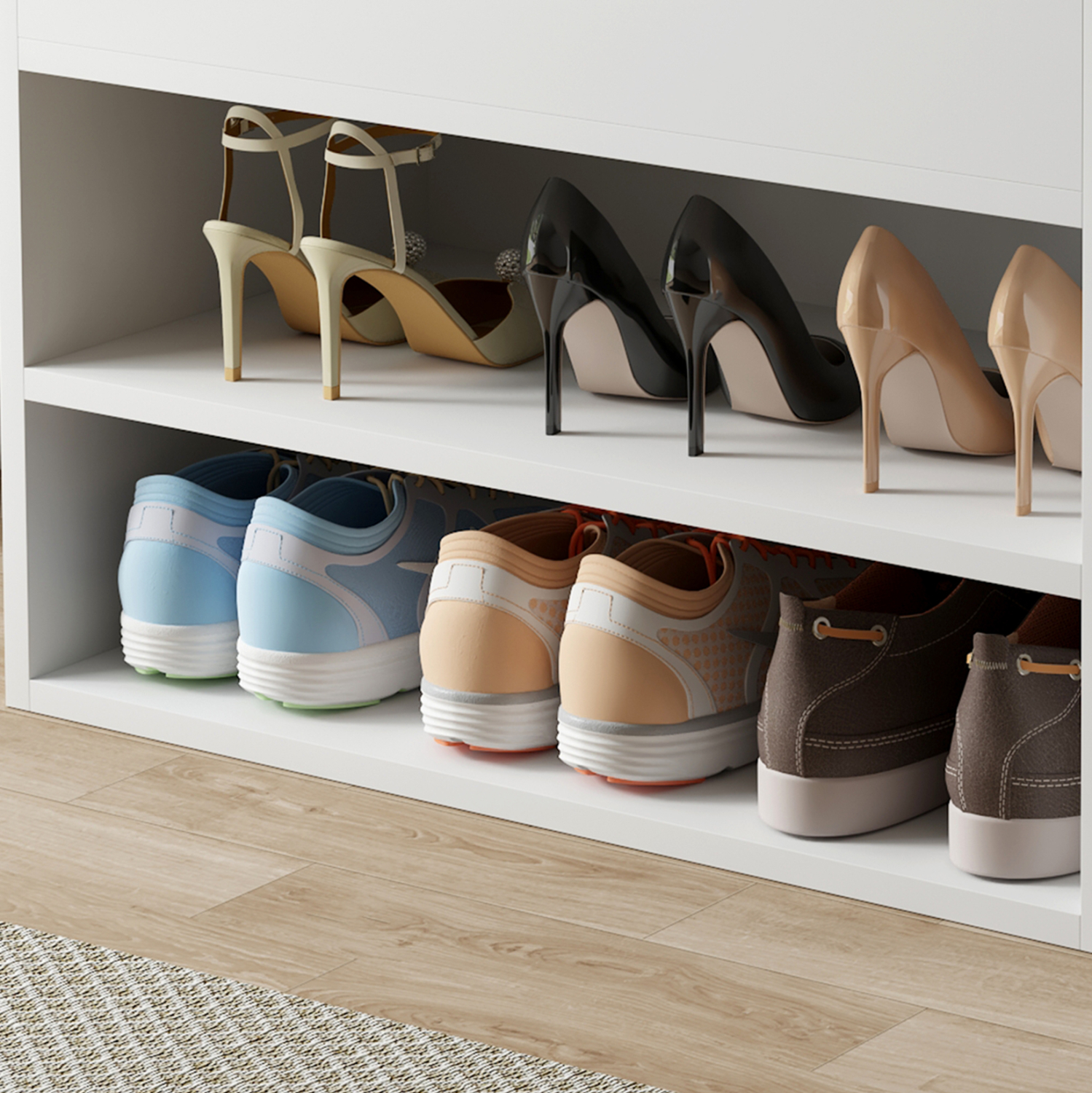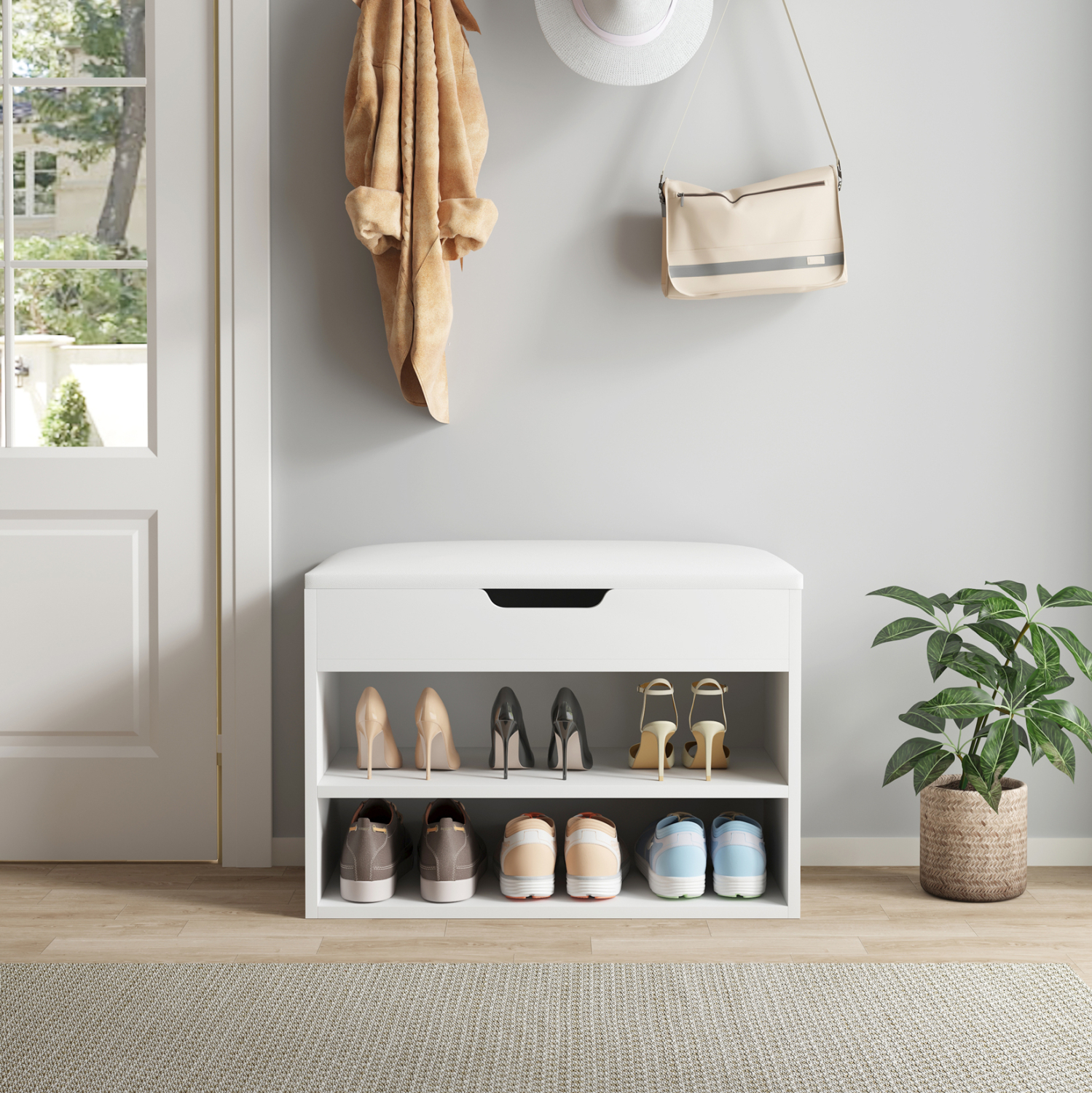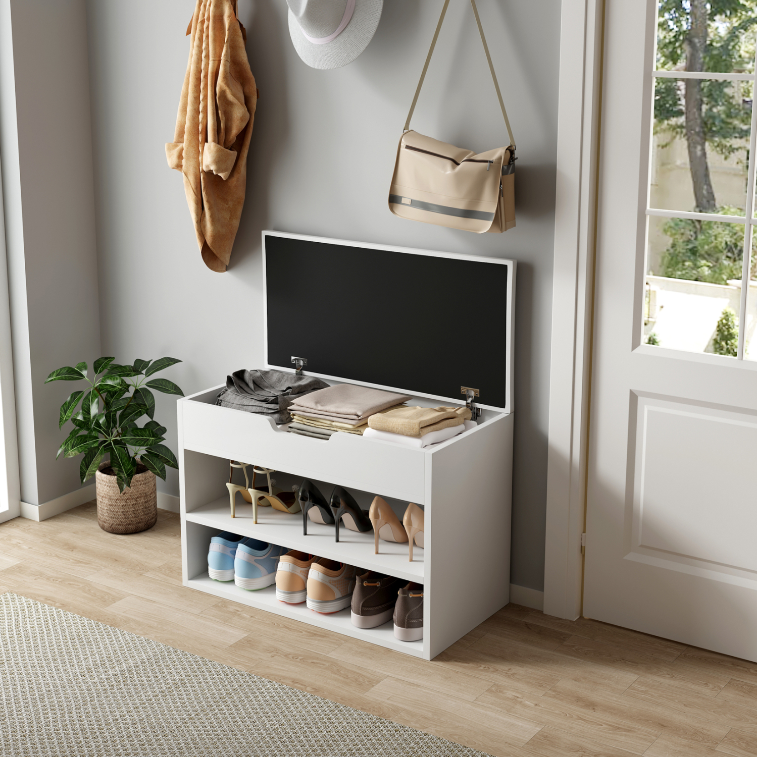 Σας αρέσει να είστε τακτοποιημένοι και καθαροί; Σας παρουσιάζουμε την παπουτσοθήκη μελαμίνης ROMIR σε ΛΕΥΚΟ χρώμα με πολύ χαμηλά μεταλλικά πόδια. Ένα έπιπλο που εκτός από χώρο αποθήκευσης παπουτσιών, διαθέτει και κάθισμα επενδυμένο με PU leather σε ΛΕΥΚΟ χρώμα, για να φοράτε τα παπούτσια σας καθιστοί. Ο χώρος αποθήκευσης είναι ανοιχτός με 2 επίπεδα, ενώ κάτω από το κάθισμα που ανασηκώνεται υπάρχει ακόμα ένας, πιο ρηχός, χώρος αποθήκευσης αντικειμένων. Σκοπός μας είναι να σας βοηθήσουμε να οργανώσετε και να βελτιώσετε με τον καλύτερο δυνατό τρόπο την λειτουργικότητα του σπιτιού σας.
