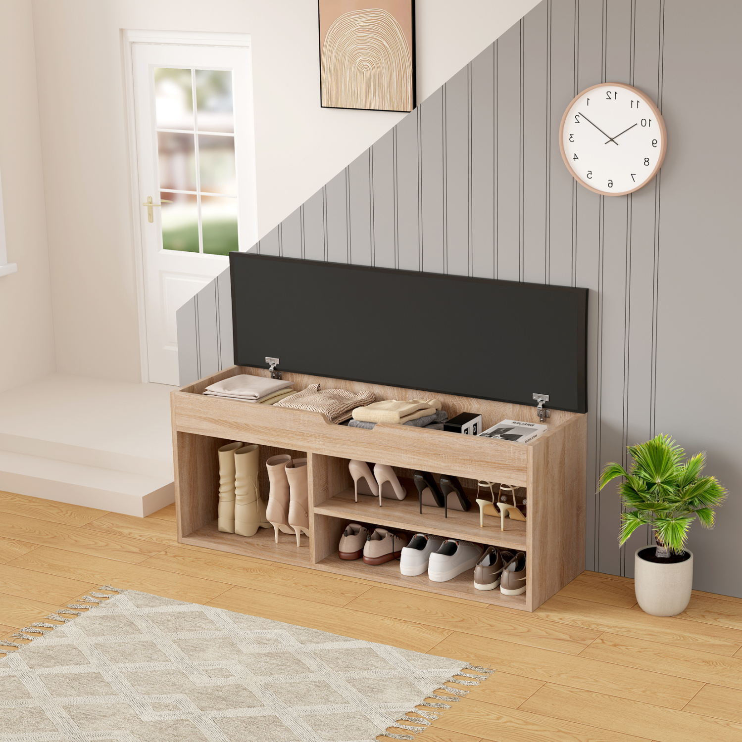 Σας αρέσει να είστε τακτοποιημένοι και καθαροί; Σας παρουσιάζουμε την παπουτσοθήκη μελαμίνης ROMIR σε SONAMA χρώμα με πολύ χαμηλά μεταλλικά πόδια. Ένα έπιπλο που εκτός από χώρο αποθήκευσης παπουτσιών, διαθέτει και κάθισμα επενδυμένο με PU leather σε ΚΑΦΕ χρώμα, για να φοράτε τα παπούτσια σας καθιστοί. Ο χώρος αποθήκευσης είναι ανοιχτός με 2 επίπεδα στην μια πλευρά και έναν μεγαλύτερο στην άλλη για ψηλότερα παπούτσια, ενώ κάτω από το κάθισμα που ανασηκώνεται υπάρχει ακόμα ένας, πιο ρηχός, χώρος αποθήκευσης αντικειμένων. Σκοπός μας είναι να σας βοηθήσουμε να οργανώσετε και να βελτιώσετε με τον καλύτερο δυνατό τρόπο την λειτουργικότητα του σπιτιού σας.