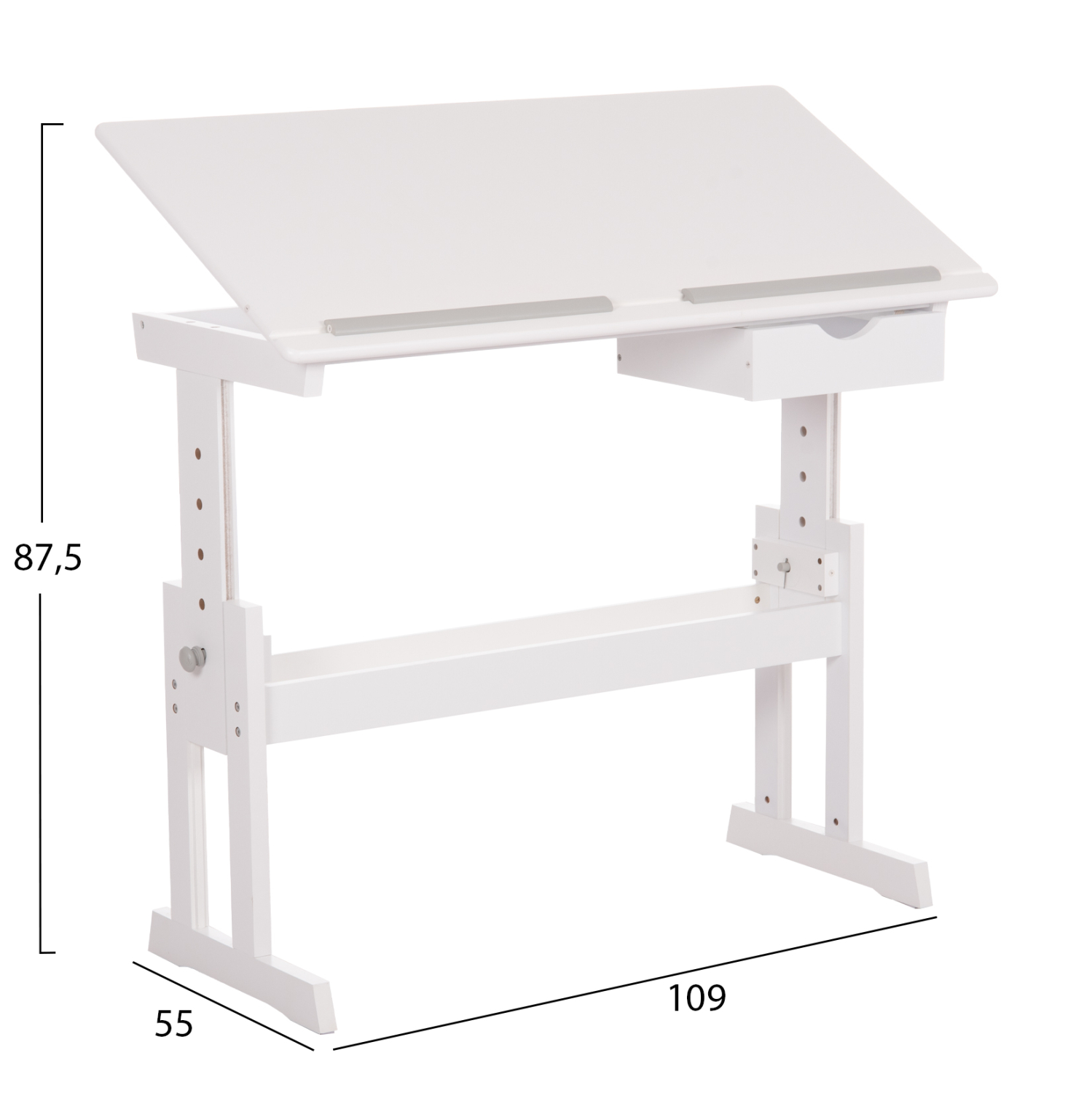 Το γραφείο/σχεδιαστήριο ASCENT είναι μια νέα ποιοτική πρόταση στα έπιπλα γραφείου. Οι διαστάσεις του το καθιστούν ιδανικό για τέτοια χρήση, ενώ τα χαρακτηριστικά του επιτείνουν την πρακτικότητά του. Η επιφάνεια του μπορεί να είναι οριζόντια, ή να της δώσετε κλίση με έναν εύχρηστο μεταλλικό μηχανισμό έτσι ώστε να μην «καμπουριάζουν» τα παιδιά κατά την χρήση. Επίσης, το ύψος της επιφάνειας είναι ρυθμιζόμενο, που σημαίνει ότι γίνεται κατάλληλο και για χρήση από όρθια θέση. Τέλος, το συρτάρι κάτω από την επιφάνεια προσφέρει τον απαραίτητο αποθηκευτικό χώρο για γραφική ύλη και τετράδια. Συνδυάστε το με μια καρέκλα γραφείου ανάλογων διαστάσεων για να δημιουργήσετε το ιδανικό σετ.