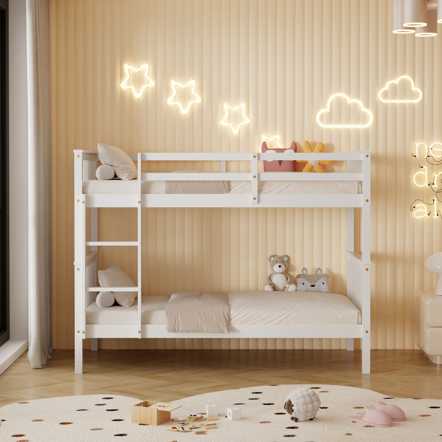 Σας παρουσιάζουμε το «LANTAI» που είναι ένα καινούργιο διώροφο παιδικό κρεβάτι-κουκέτα. Τα κρεβάτια είναι σε διάσταση για μονό στρώμα 90x190 εκ, και αποτελεί μια άριστης ποιότητας, μοντέρνα και ασφαλή επιλογή για το παιδικό δωμάτιο. Η κουκέτα είναι ξύλινη σε ΛΕΥΚΟ χρώμα βαμμένο με αβλαβές βερνίκι με βάση το νερό και μη τοξικό, ιδανικό για παιδιά. Τα στρώματα τοποθετούνται σε τάβλες κατασκευασμένες από ξυλεία κόντρα πλακέ. Διαθέτει όμορφη σκάλα πρόσβασης στο επάνω κρεβάτι καθώς και κάγκελα προστασίας περιμετρικά στο επάνω κρεβάτι, ενώ τα πόδια είναι σχετικά ψηλά, αφήνοντας χώρο για αποθήκευση πραγμάτων και εύκολο καθάρισμα. Αυτό, όμως, που κάνει αυτή την κουκέτα να ξεχωρίζει είναι ότι σας δίνει την δυνατότητα να χρησιμοποιήσετε τα δύο κρεβάτια ξεχωριστά και όχι απαραίτητα ως κουκέτα!