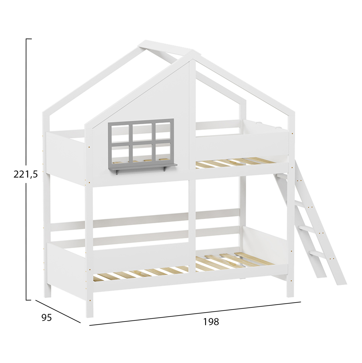 Σας παρουσιάζουμε την καινούργια παιδική κουκέτα-κρεβάτι COMBO τύπου Montessori που σημαίνει ότι έχει σχεδιαστεί σύμφωνα με το εκπαιδευτικό σύστημα Montessori, σύμφωνα με το οποίο τα παιδιά μαθαίνουν καλύτερα, όταν επιλέγουν μόνα τους τι θα κάνουν. Είναι σε διάσταση για μονά στρώματα 90x200 εκ, και αποτελεί μια άριστης ποιότητας, μοντέρνα και ασφαλή επιλογή για το παιδικό δωμάτιο. Είναι ξύλινη σε ΛΕΥΚΟ χρώμα βαμμένη με αβλαβές μη τοξικό βερνίκι με βάση το νερό, ιδανικό για παιδιά. Τα στρώματα τοποθετούνται σε τάβλες κατασκευασμένες από ξυλεία κόντρα πλακέ. Η κουκέτα έχει σχήμα σπιτάκι και μάλιστα το επάνω κρεβάτι έχει κι ένα παραθυράκι με εξωτερικό ράφι που θα εξάψει την φαντασία των παιδιών. Η πρόσβαση στο επάνω κρεβάτι το οποίο διαθέτει και κάγκελα περιμετρικά, γίνεται με μια όμορφη κρεμαστή σκάλα που μπορεί να τοποθετηθεί από όποια πλευρά σας βολεύει. Το κάτω κρεβάτι διαθέτει επίσης κάγκελα, αλλά και σχετικά ψηλά πόδια.