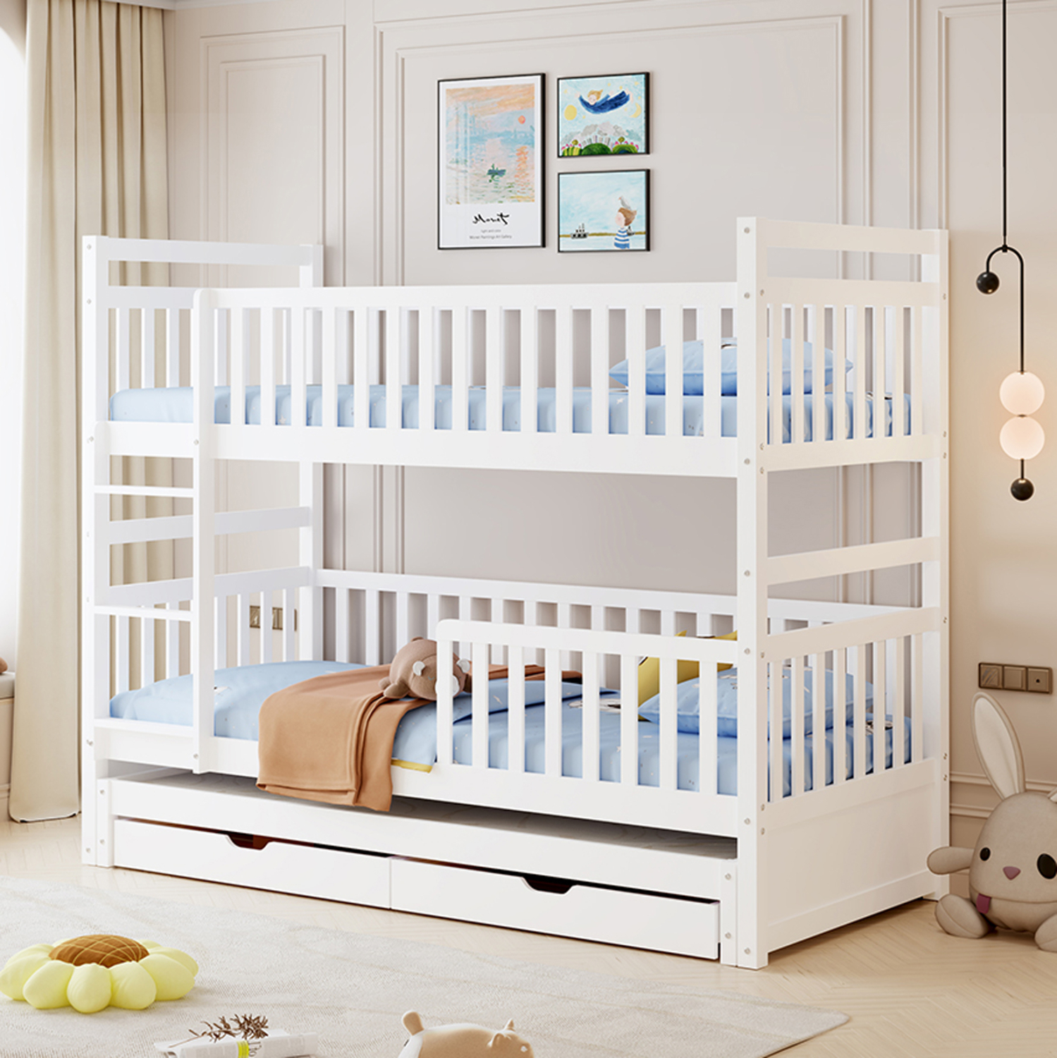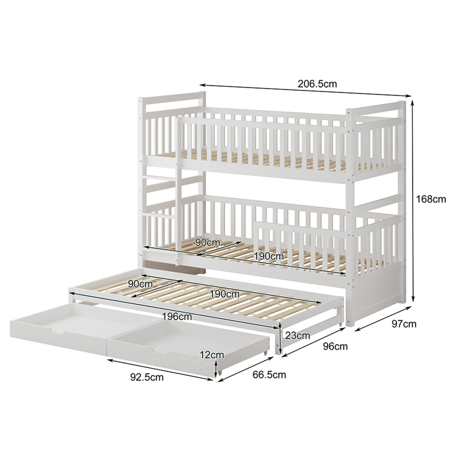 Σας παρουσιάζουμε το καινούργιο παιδικό κρεβάτι-κουκέτα TRIPLON σε διάσταση για μονά στρώματα 90x190 & 200 εκ, και αποτελεί μια άριστης ποιότητας, μοντέρνα και ασφαλή επιλογή για το παιδικό δωμάτιο. Είναι ξύλινο σε ΛΕΥΚΟ χρώμα βαμμένο με αβλαβές μη τοξικό βερνίκι με βάση το νερό, ιδανικό για παιδιά. Τα στρώματα τοποθετούνται σε τάβλες κατασκευασμένες από ξυλεία κόντρα πλακέ. Η πρόσβαση στο επάνω κρεβάτι γίνεται με πρακτική κάθετη σκάλα, ενώ και τα δύο κρεβάτια διαθέτουν περιμετρικά κάγκελα. Ωστόσο, αυτή η κουκέτα ξεχωρίζει για το γεγονός ότι έχει και ένα ακόμα κρεβάτι που είναι συρόμενο και τοποθετείται στο κάτω μέρος της κουκέτας, όπως και 2 συρτάρια στα οποία μπορείτε να τοποθετήσετε οτιδήποτε χρειαστεί. Μια ιδανική πρόταση για σπίτια με περιορισμένο χώρο.