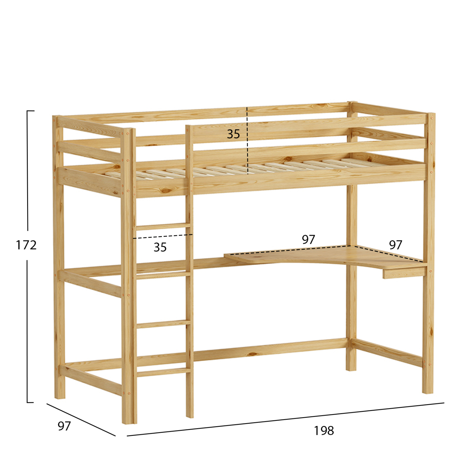 Σας παρουσιάζουμε το καινούργιο παιδικό κρεβάτι-κουκέτα AKRON σε διάσταση για μονό στρώμα 90x190 εκ, και αποτελεί μια άριστης ποιότητας, μοντέρνα και ασφαλή επιλογή για το παιδικό δωμάτιο. Είναι ξύλινο σε ΦΥΣΙΚΟ χρώμα βαμμένο με αβλαβές βερνίκι με βάση το νερό και μη τοξικό, ιδανικό για παιδιά. Το στρώμα τοποθετείται σε τάβλες κατασκευασμένες από ξυλεία κόντρα πλακέ. Η πρόσβαση στο κρεβάτι γίνεται με πρακτική σκάλα, ενώ στο κάτω μέρος υπάρχει γωνιακό γραφείο. Μια ιδανική πρόταση για δωμάτια με περιορισμένο χώρο.
