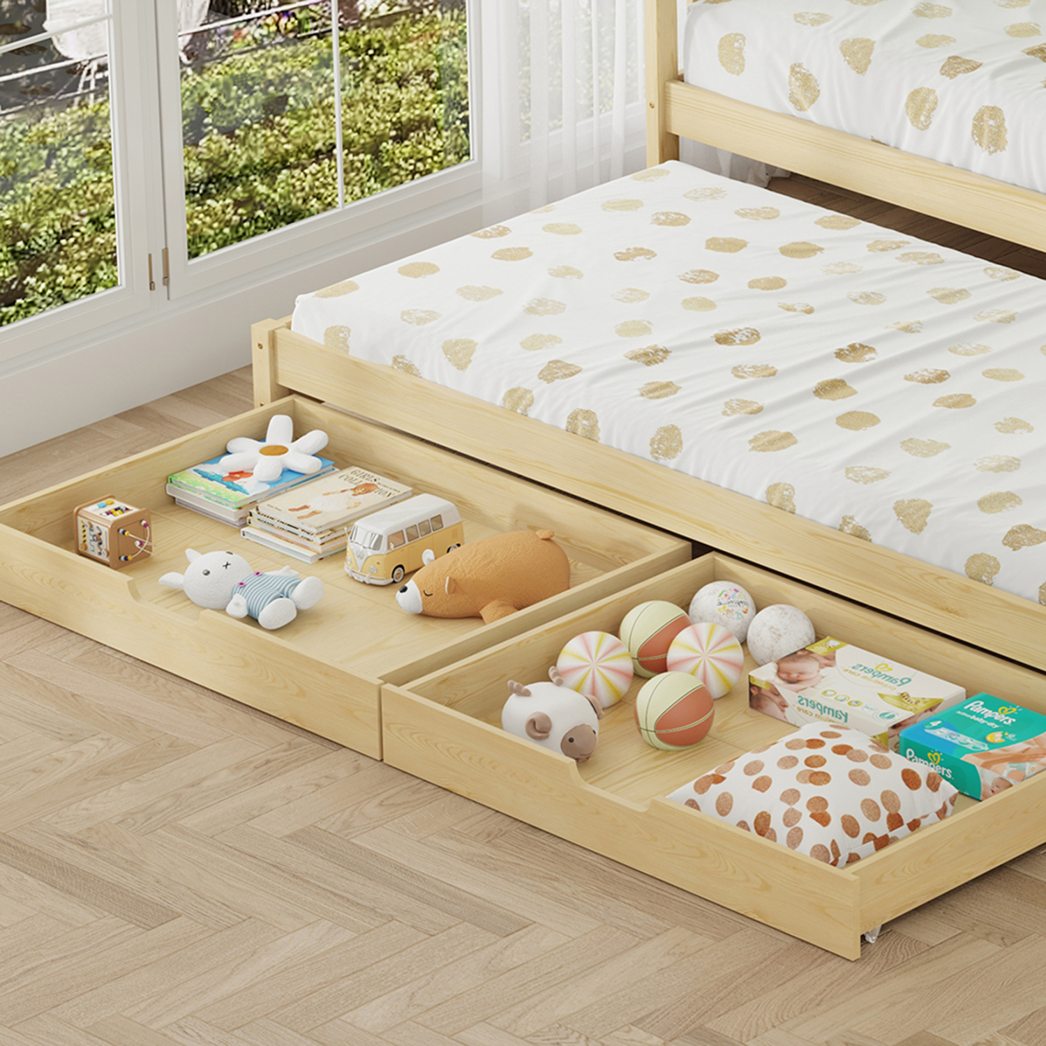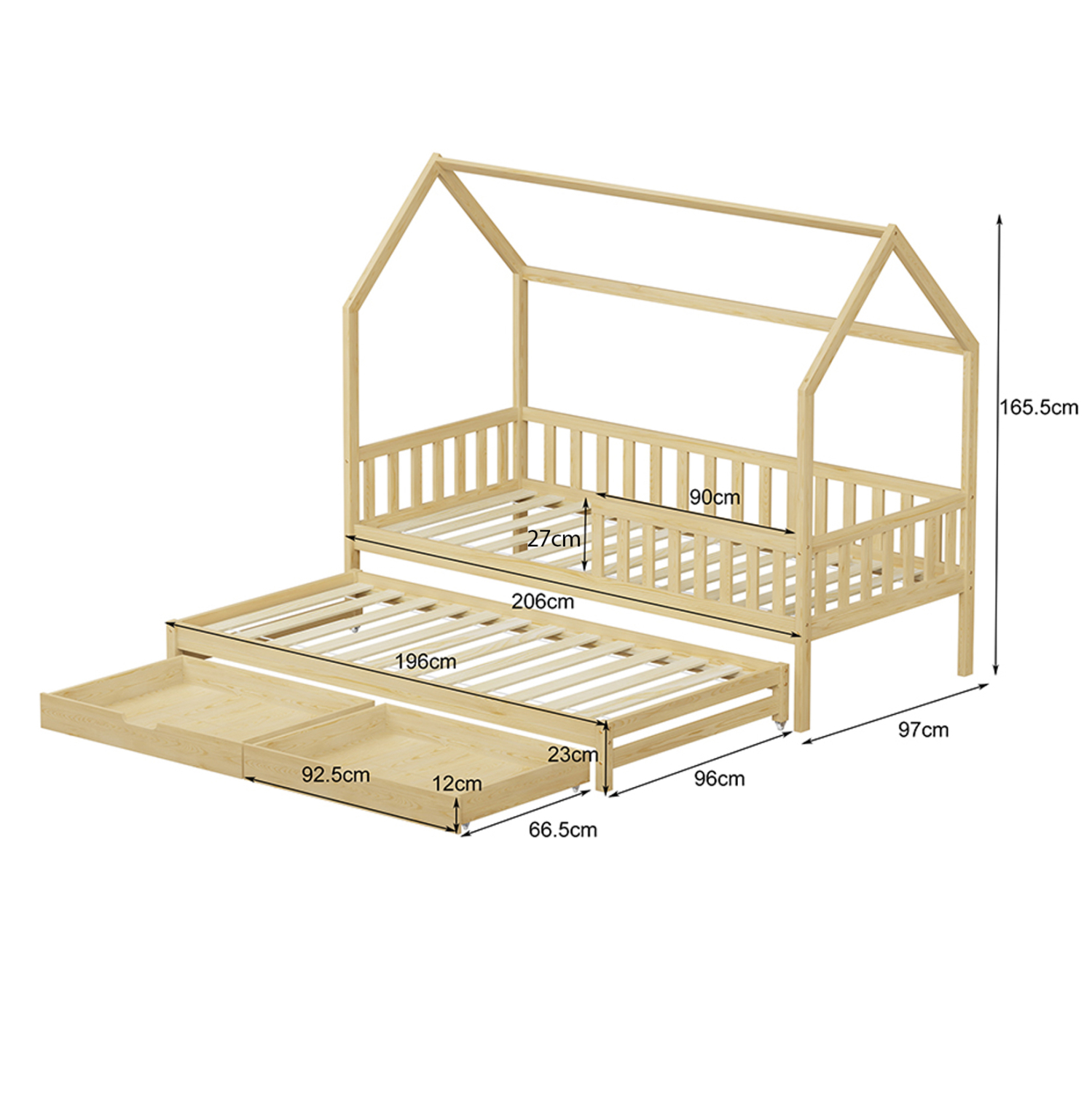 Το συγκεκριμένο διαθέτει και δεύτερο πρόσθετο κρεβάτι που αποθηκεύεται κάτω από κυρίως κρεβάτι, ενώ διαθέτει και δύο συρόμενα ρηχά συρτάρια κάτω από το πρόσθετο. Είναι σε διάσταση για μονό στρώμα 90x200 εκ το κυρίως κρεβάτι, και 90x190εκ το πρόσθετο, και αποτελεί μια άριστης ποιότητας, μοντέρνα και ασφαλή επιλογή για το παιδικό δωμάτιο μιας και διαθέτει ξύλινο κάγκελο περιμετρικά.
