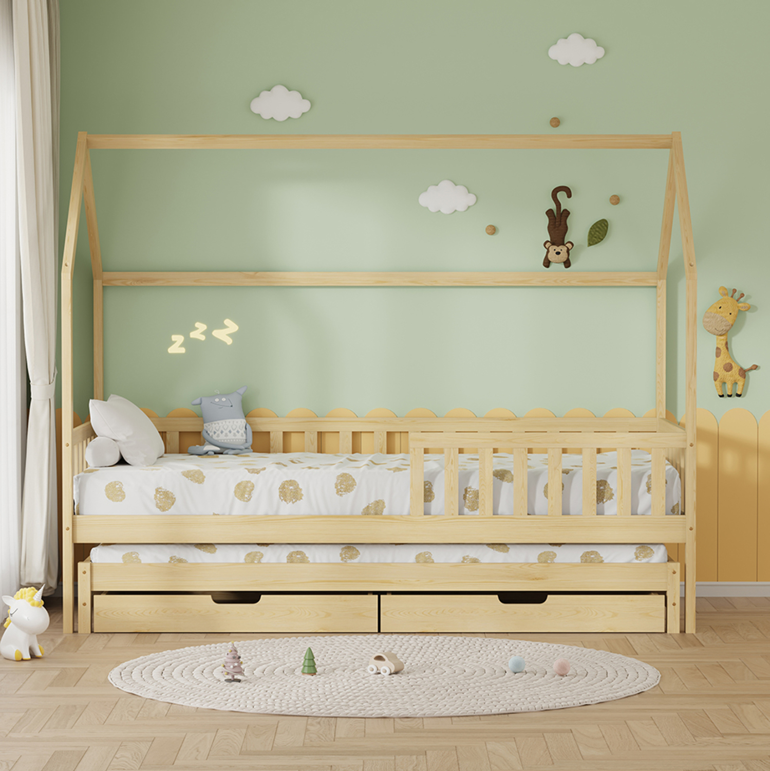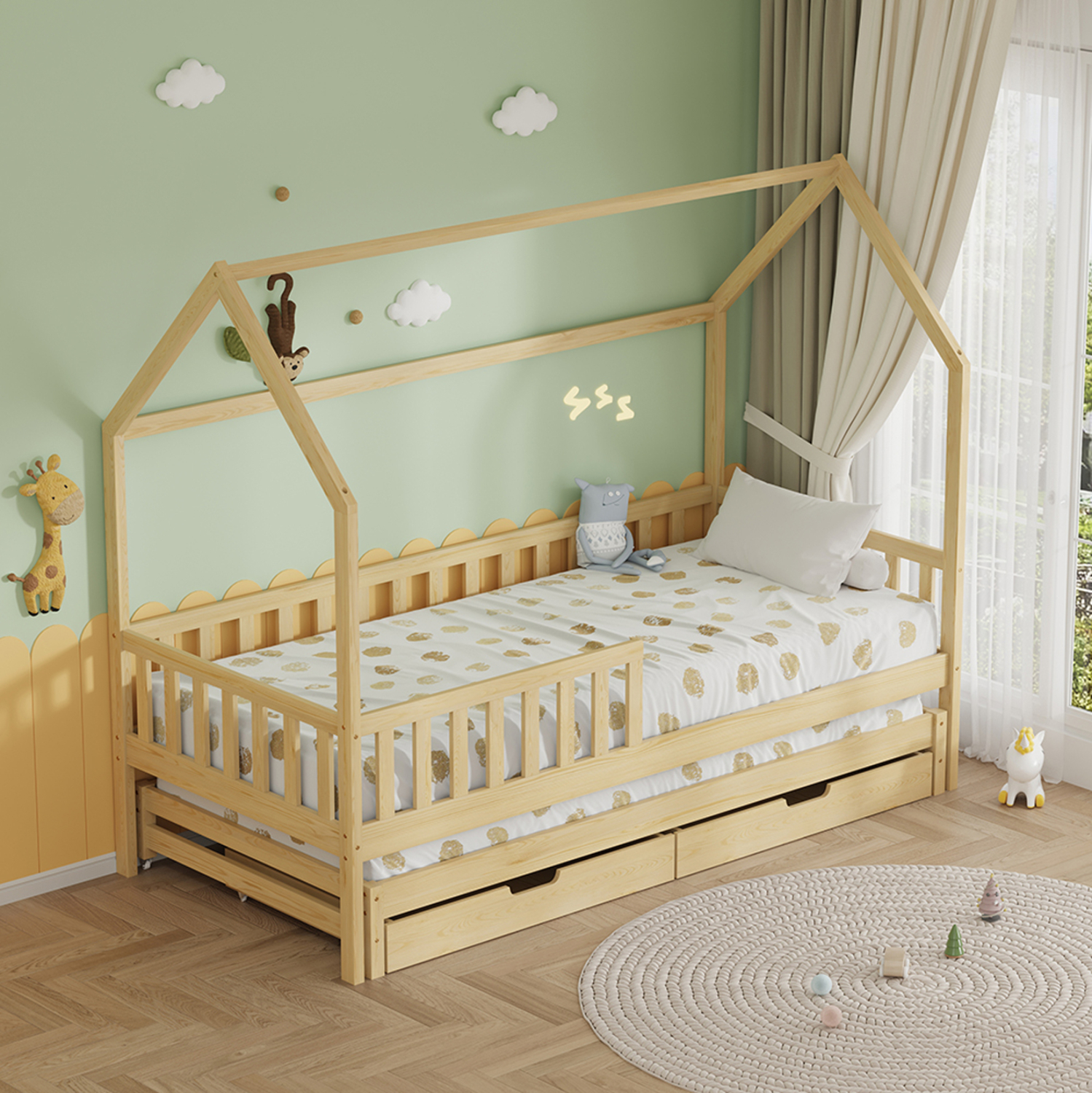 Τα στρώματα τοποθετούνται σε τάβλες κατασκευασμένες από ξυλεία κόντρα πλακέ. Ολόκληρο το κρεβάτι έχει σχήμα σπιτιού και μάλιστα αρκετά ψηλό, που θα δώσει μια ευχάριστη, «ζεστή», και παιχνιδιάρικη όψη σε κάθε παιδικό δωμάτιο.