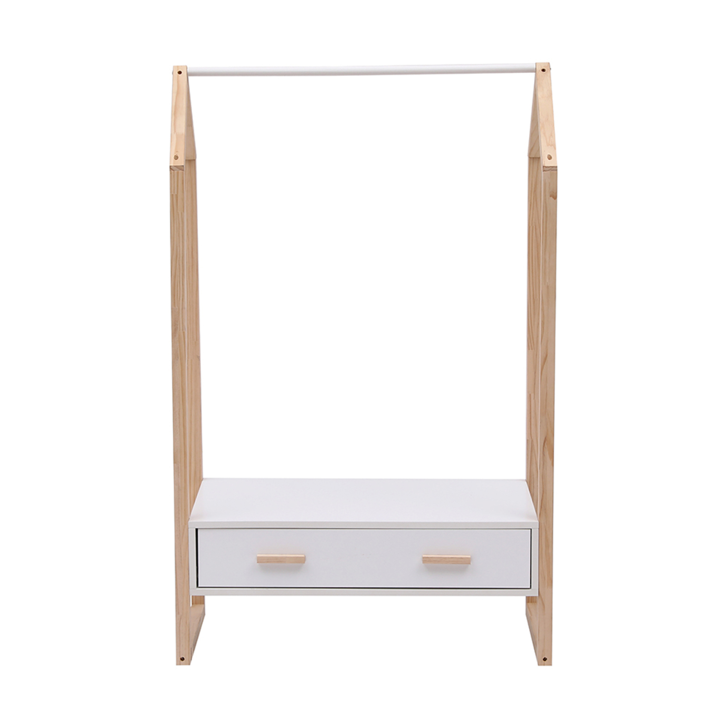 Σας παρουσιάζουμε την καινούργια παιδική ανοιχτή κρεμάστρα PEPE. Είναι βολική σε διαστάσεις και διαθέτει μία μπάρα κρέμασης ρούχων και 1 πρακτικό συρτάρι με εσωτερικό χώρισμα στο κάτω μέρος, σε ΛΕΥΚΟ χρώμα. Στηρίζεται σε ξύλινο σκελετό/πόδια με σχήμα που παραπέμπει σε σπιτάκι σε ΦΥΣΙΚΟ χρώμα ξύλου στις δύο πλευρές. Είναι βαμμένη με αβλαβές μη τοξικό βερνίκι με βάση το νερό, ιδανικό για παιδιά.