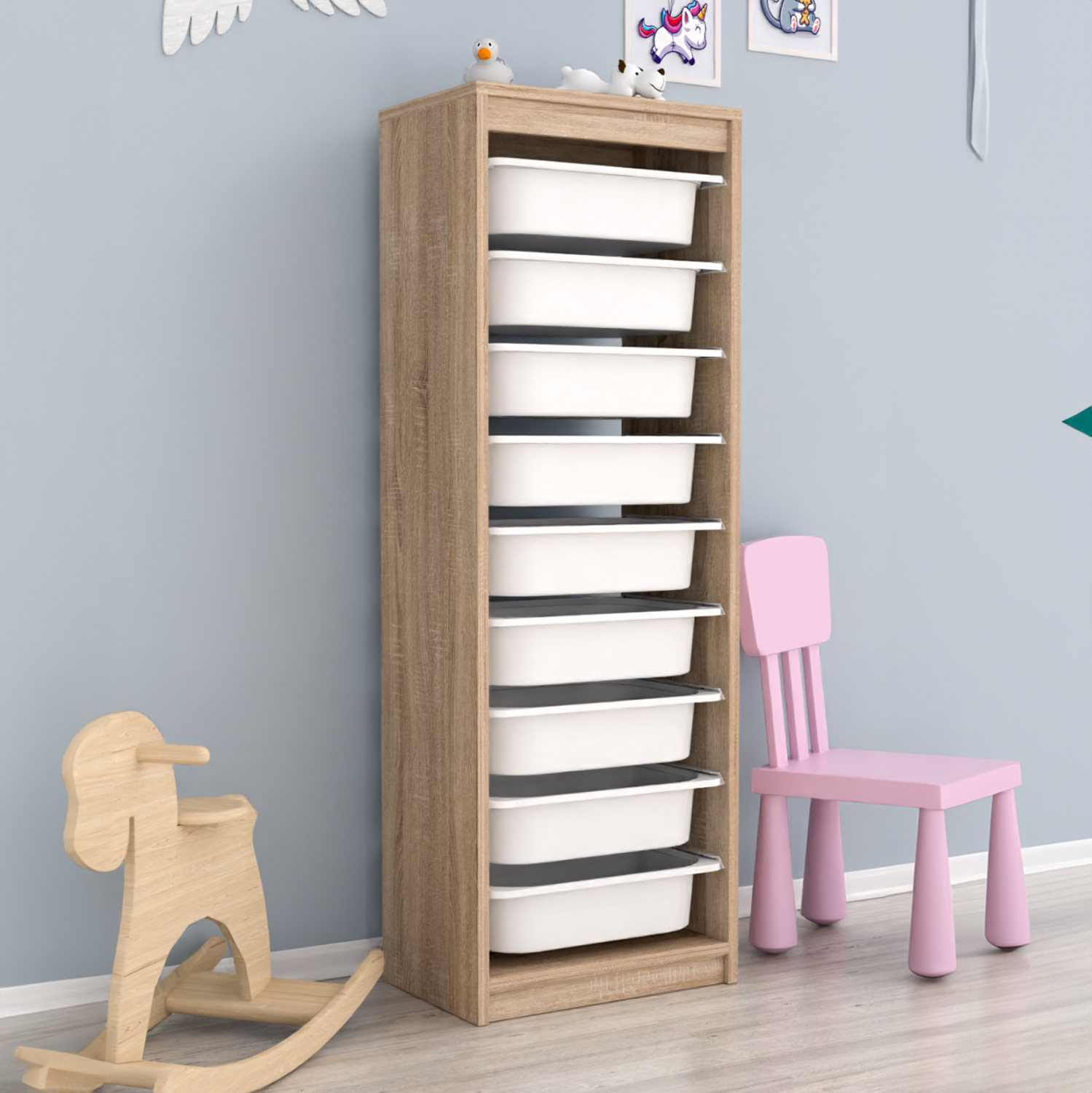 Η SANI είναι μια ψηλή συρταριέρα με πλαίσιο από μελαμίνη σε χρώμα SONAMA, με 9 ΛΕΥΚΑ συρτάρια από πολυαιθυλένιο (πλαστικό). Ιδανική συρταριέρα για την καλύτερη οργάνωση του παιδικού δωματίου.