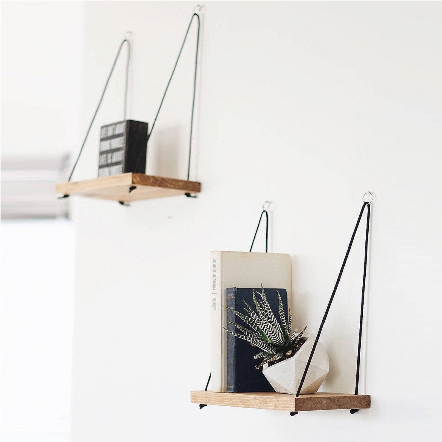 Ραφιέρα τοίχου από ξύλινη βάση σε φυσική απόχρωση και μαύρο σχοινί.