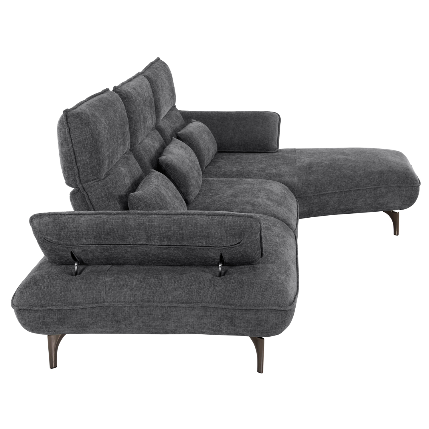 Σας παρουσιάζουμε τον CONVERT, έναν εκπληκτικό μεγάλο καναπέ-κρεβάτι σε διαμόρφωση ΔΕΞΙΑΣ γωνίας (όπως τον κοιτάς) επενδυμένο με ποιοτικό ύφασμα σε ΓΚΡΙ χρώμα. Το design του κλέβει τις εντυπώσεις και μαγνητίζει τα βλέμματα, χάρη στις ξεκάθαρες «γραμμές» του. Τα μπράτσα έχουν την μορφή μαξιλαριών αλλά είναι μέρος του καναπέ και μπορούν με μεταλλικό ΙΝΟΧ μηχανισμό να ανεβοκατεβαίνουν σε 3 επίπεδα. Η πλάτη αποτελείται από 3 μεγάλα τετράγωνα μαξιλάρια τα οποία, όπως και τα μπράτσα, μετακινούνται με υφασμάτινα χερούλια και μεταλλικό μηχανισμό προς τα πίσω αφήνοντας αρκετό χώρο για ένα μονό κρεβάτι. Το κομμάτι που σχηματίζει την γωνία είναι ίδιας αισθητικής και ενώνεται με τον κυρίως καναπέ με κατακόρυφους αναρτήρες πάνελ. Το κάθισμα διαθέτει γεμίσματα αφρού μεσαίας σκληρότητας σε συνδυασμό με ελατήρια pocket springs, προσφέροντας απαράμιλλη άνεση. Τέλος, την εικόνα συμπληρώνουν τα ψηλά σκούρα ασημί μεταλλικά πόδια, αλλά και τα 3 μικρά διακοσμητικά μαξιλαράκια.
