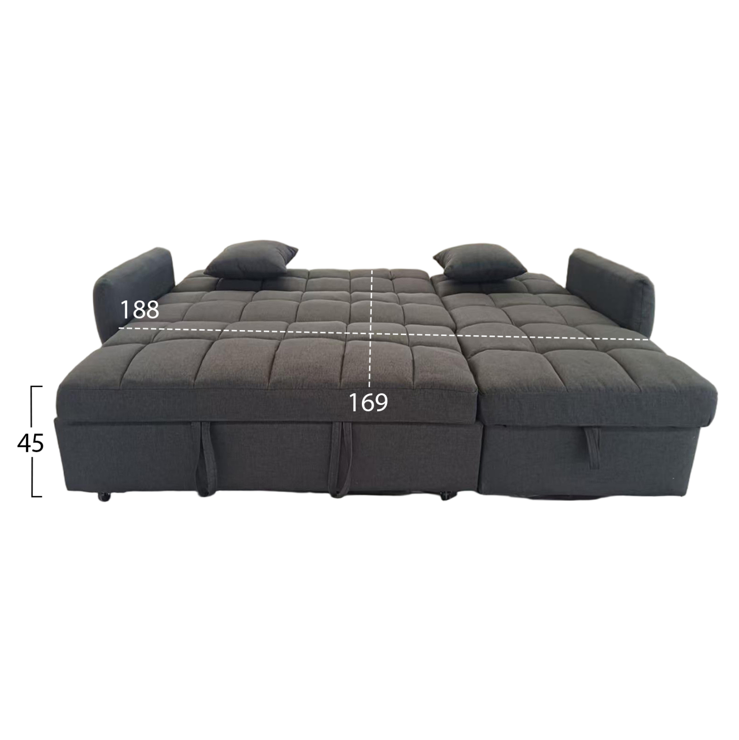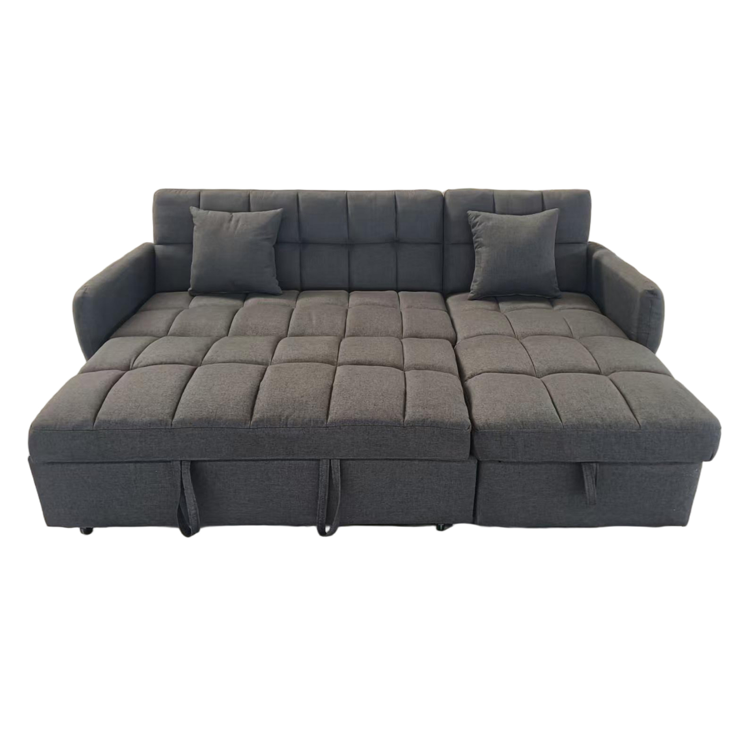 Επενδεδυμένος με γκρι ύφασμα και καπιτονέ μοτίβο, προσθέτει κομψότητα και ζεστή αισθητική στο περιβάλλον. Ο μηχανισμός μετατροπής σε κρεβάτι είναι απλός και ομαλός, προσφέροντας άνετη επιφάνεια ύπνου.