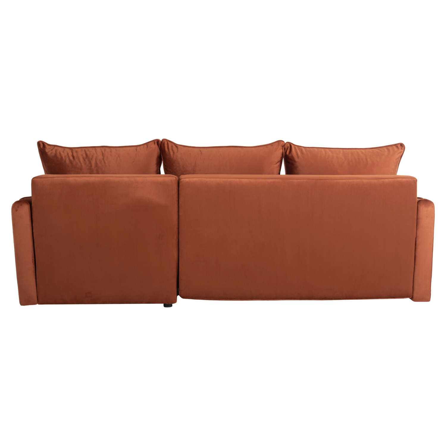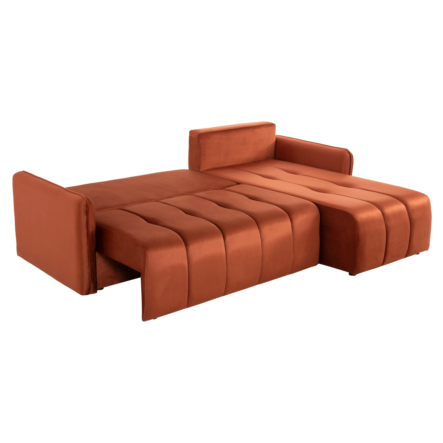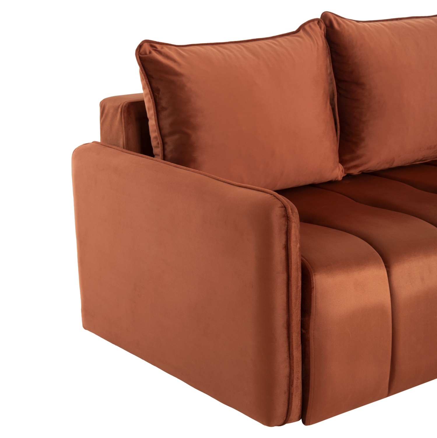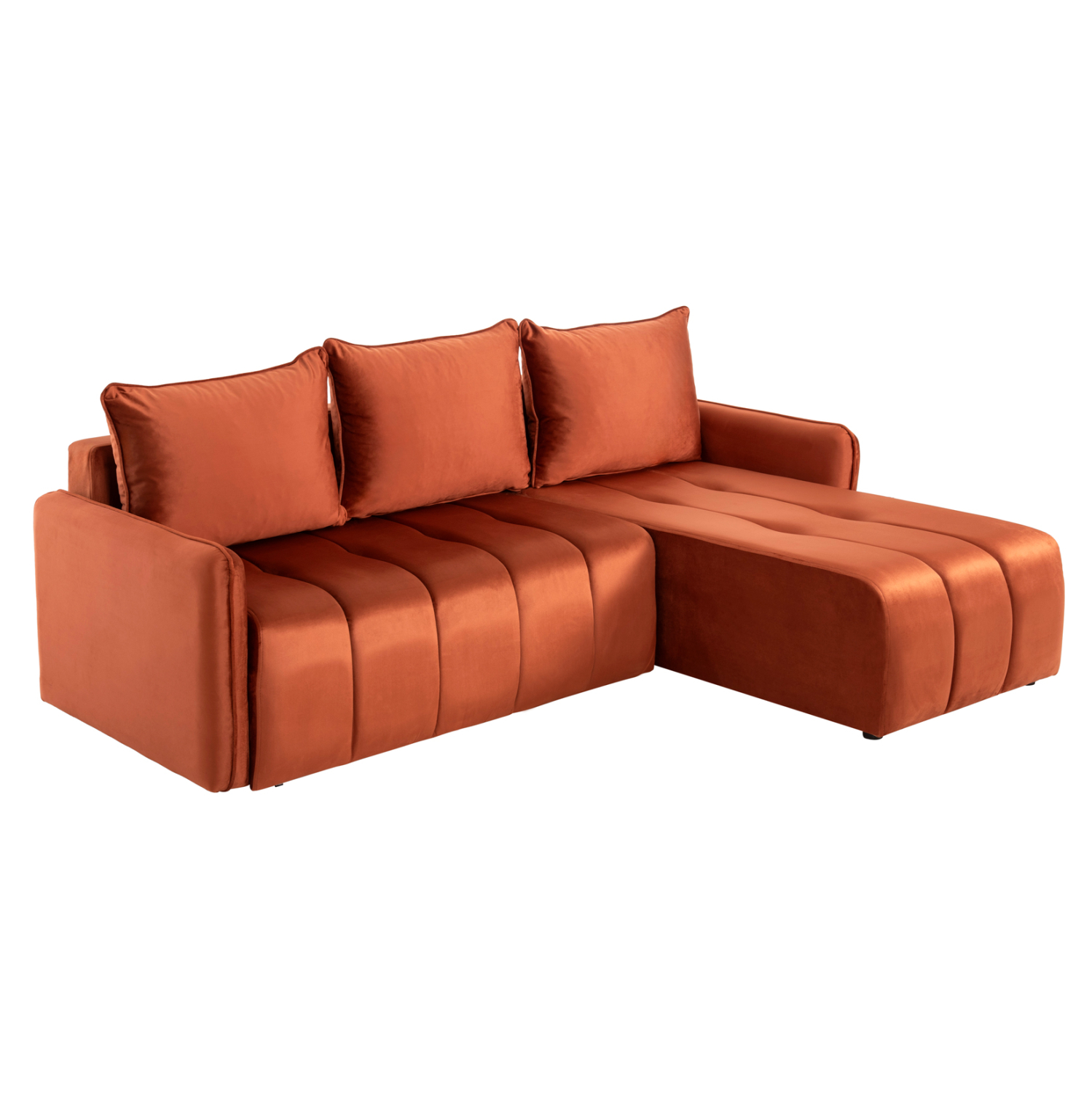 Ο PROTON είναι ένας 3-θέσιος καναπές που είναι αναστρέψιμος, δηλαδή να διαμορφωθεί είτε σε δεξιά, είτε σε αριστερή γωνία. Είναι επενδυμένος με βελούδο σε ΠΟΡΤΟΚΑΛΙ χρώμα ενώ το κομμάτι που σχηματίζει την γωνία ενώνεται με τον κυρίως καναπέ με κατακόρυφους αναρτήρες πάνελ. Διαθέτει 3 μαξιλάρια πλάτης, ενώ το κάθισμα με το στυλ καπιτονέ ραφών, διαθέτει γεμίσματα αφρού μεσαίας σκληρότητας και φτάνει σαν «ποδιά» μέχρι χαμηλά και στα 2 κομμάτια του καναπέ. Το χαρακτηριστικό, όμως, που κάνει αυτόν τον υπέροχο καναπέ να ξεχωρίζει, είναι ότι με δύο απλές κινήσεις γίνεται διπλό κρεβάτι, προσφέροντας μια ποιοτική λύση όπου και όταν χρειαστεί! Σύρετε το κάθισμα μπροστά (σπρώχνοντας από το πίσω μέρος), το οποίο είναι εύκολο επειδή στηρίζεται σε ράγες στον μεταλλικό σκελετό, και μετά διπλώνετε την πλάτη του καναπέ η οποία ανοίγει και κλείνει πανεύκολα! Και σαν να μην έφτανε αυτό, ακριβώς κάτω από το κάθισμα του κυρίως καναπέ, υπάρχει αποθηκευτικός χώρος που ολοκληρώνει την πρακτικότητα αυτού του μοναδικού επίπλου!