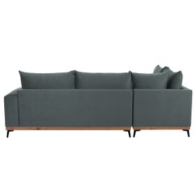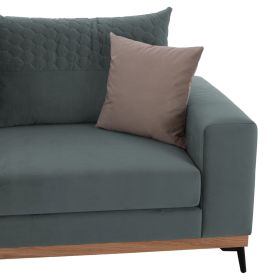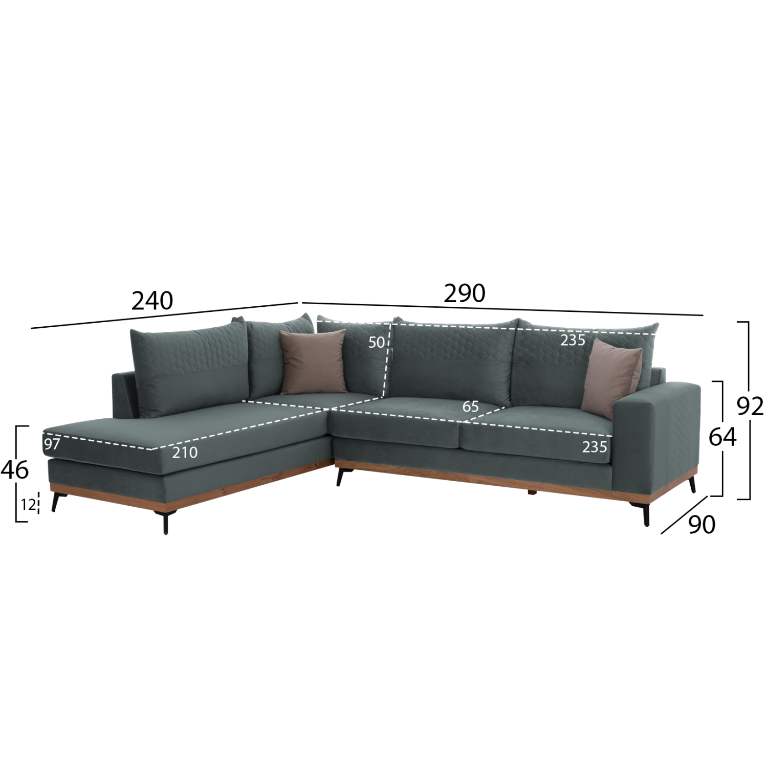 Ξεκινώντας από τα βασικά και τα προφανή, το χρώμα της βελούδινης επένδυσης του μεγάλου αυτού καναπέ είναι SAHARA 17- μέντα. Διαθέτει 5 μαξιλάρια πλάτης στο ίδιο χρώμα και δύο μικρότερα διακοσμητικά μαξιλάρια σε SAHARA 03- εκρού χρώμα. Τα 4 μαξιλάρια καθίσματος σε συνδυασμό με αυτά της πλάτης, δίνουν την τέλεια αίσθηση άνεσης! Τα μαξιλάρια πλάτης έχουν τεχνοτροπία καπιτονέ κατά το ήμισυ, όπως υπάρχει και μια πανέμορφη καπιτονέ λωρίδα στο μεγάλο μπράτσο. Το μεγάλο μαξιλάρι καθίσματος που σχηματίζει την γωνία δεν θα δυσκολέψει τον χρήστη φεύγοντας από την θέση του, επειδή διαθέτει «χρατς» και κολλάει στην ειδική επιφάνεια του σκελετού. Το κομμάτι που δημιουργεί την αριστερή γωνία, είναι κουμπωτό και συνδέεται με τον υπόλοιπο καναπέ αρμονικά με ενισχυμένους γαλβανιζέ αναρτήρες πάνελ (κατακόρυφα συρταρωτά) για τεράστια αντοχή και ευκολία στην χρήση.