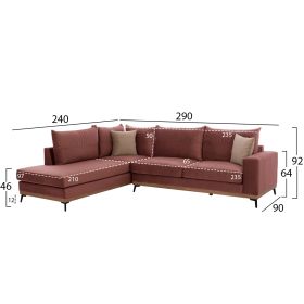 Ξεκινώντας από τα βασικά και τα προφανή, το χρώμα της βελούδινης επένδυσης του μεγάλου αυτού καναπέ είναι SAHARA 08- σάπιο μήλο. Διαθέτει 5 μαξιλάρια πλάτης στο ίδιο χρώμα και δύο μικρότερα διακοσμητικά μαξιλάρια σε SAHARA 03- εκρού χρώμα. Τα 4 μαξιλάρια καθίσματος σε συνδυασμό με αυτά της πλάτης, δίνουν την τέλεια αίσθηση άνεσης! Τα μαξιλάρια πλάτης έχουν τεχνοτροπία καπιτονέ κατά το ήμισυ, όπως υπάρχει και μια πανέμορφη καπιτονέ λωρίδα στο μεγάλο μπράτσο. Το μεγάλο μαξιλάρι καθίσματος που σχηματίζει την γωνία δεν θα δυσκολέψει τον χρήστη φεύγοντας από την θέση του, επειδή διαθέτει «χρατς» και κολλάει στην ειδική επιφάνεια του σκελετού. Το κομμάτι που δημιουργεί την αριστερή γωνία, είναι κουμπωτό και συνδέεται με τον υπόλοιπο καναπέ αρμονικά με ενισχυμένους γαλβανιζέ αναρτήρες πάνελ (κατακόρυφα συρταρωτά) για τεράστια αντοχή και ευκολία στην χρήση.