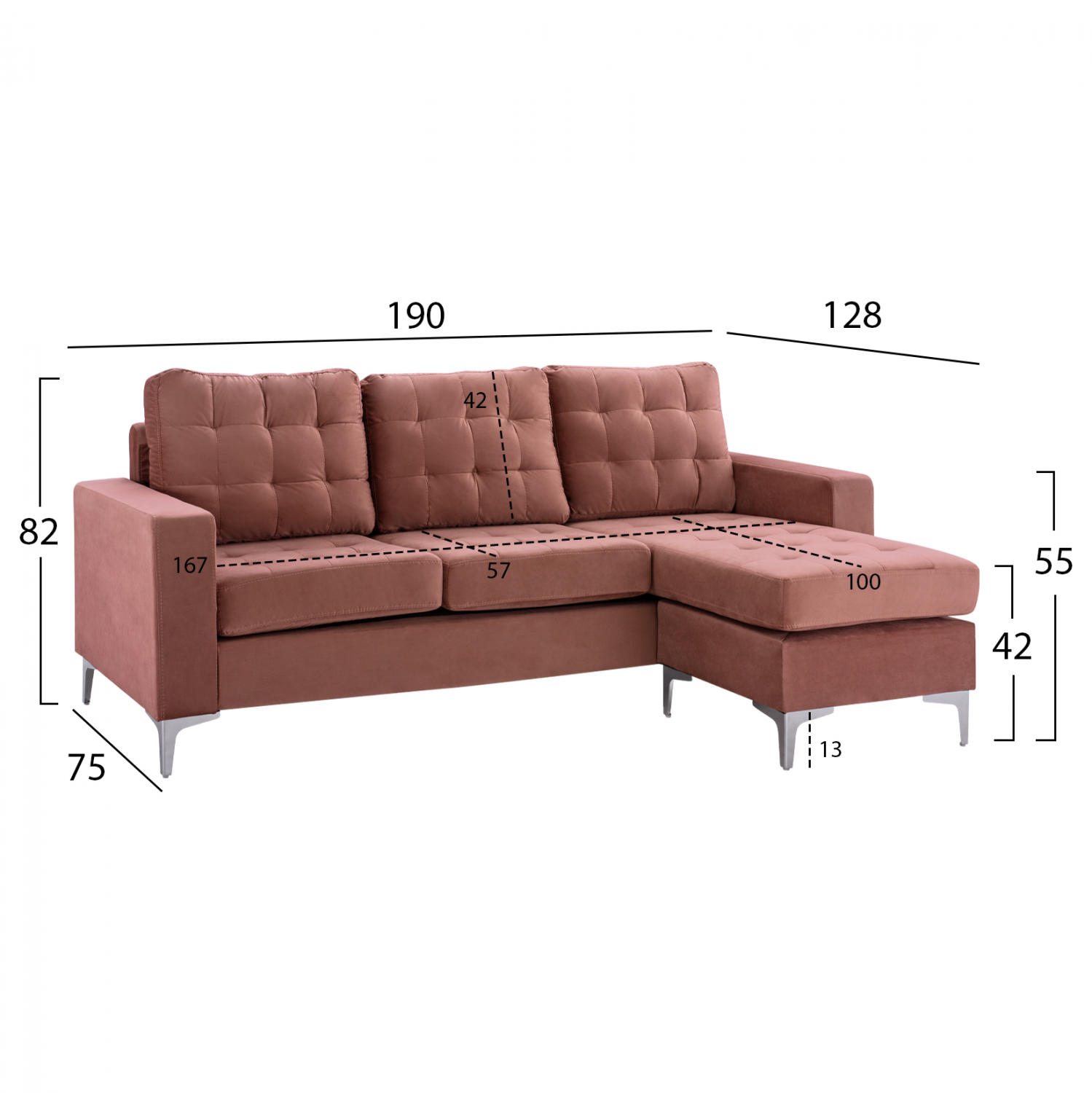 Καναπές γωνία, επενδεδυμένος με βελούδινο ύφασμα σε σάπιο μήλο απόχρωση 190x75-128x82Υ εκ.