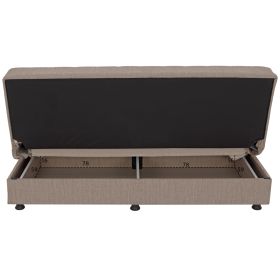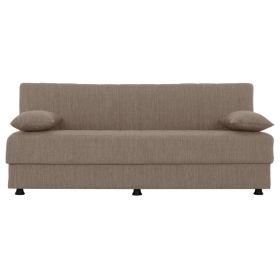 Ξεκινώντας από τα βασικά και τα προφανή, το χρώμα της επένδυσης με το εξαιρετικό και καλοραμμένο ύφασμα αυτού του καναπέ, είναι ΜΠΕΖ. Διαθέτει 2 μικρά μακρόστενα μαξιλάρια με το ίδιο ύφασμα που μπορούν να χρησιμοποιηθούν όπως θέλει ο καθένας. Χαρακτηριστικό αυτού του καναπέ είναι ότι δεν διαθέτει μπράτσα με αποτέλεσμα να μην περιορίζει την χρήση του από τους χρήστες του. Επίσης, γίνεται πολύ εύκολα κρεβάτι μέσω ενός εύχρηστου μηχανισμού (κλικ-κλακ) πολλαπλασιάζοντας την χρησιμότητά του. Κάτω από το κάθισμα του καναπέ υπάρχουν 2 αποθηκευτικοί χώροι με ενισχυμένο πάτωμα καθιστώντας τον ένα πραγματικό πολυεργαλείο, ειδικά για φοιτητικά σπίτια αλλά και σπίτια με περιορισμένο γενικά χώρο.