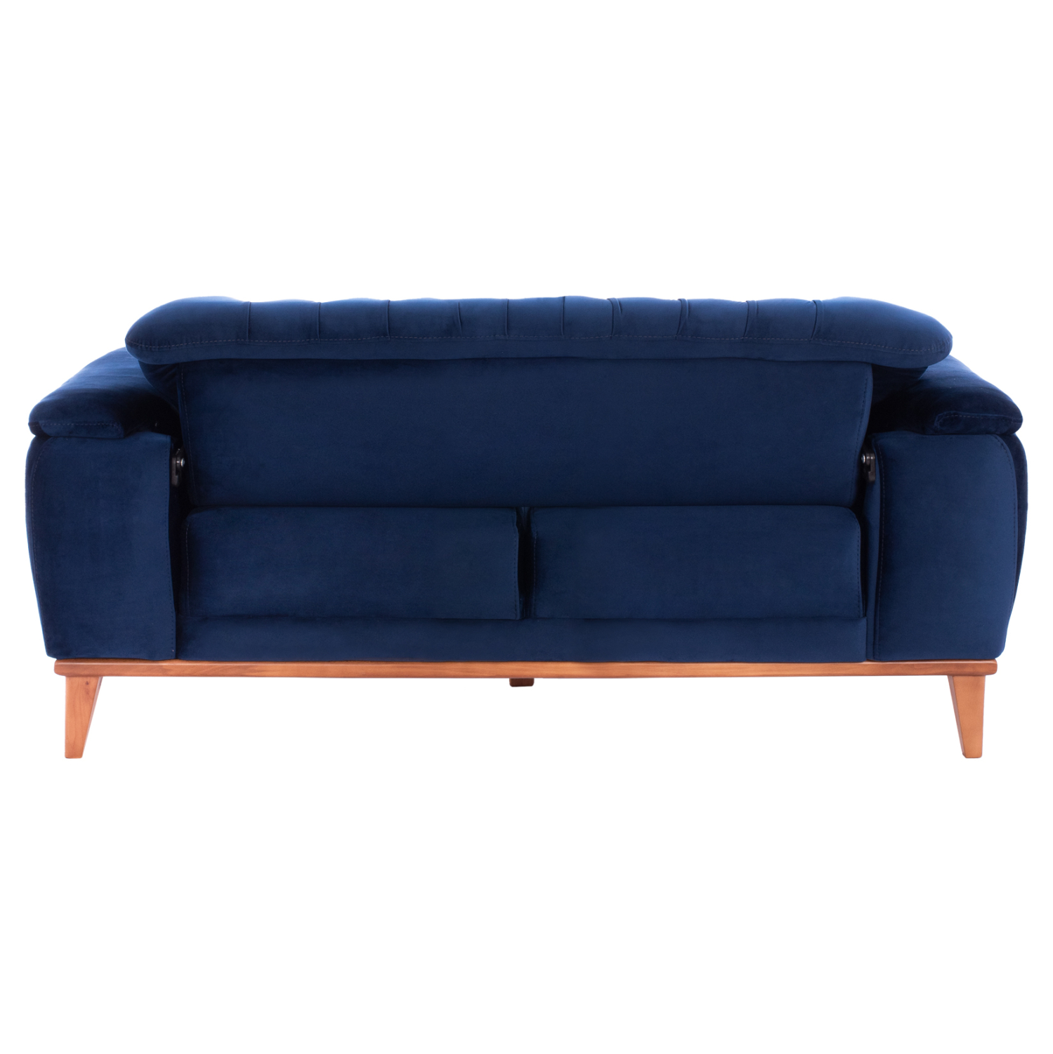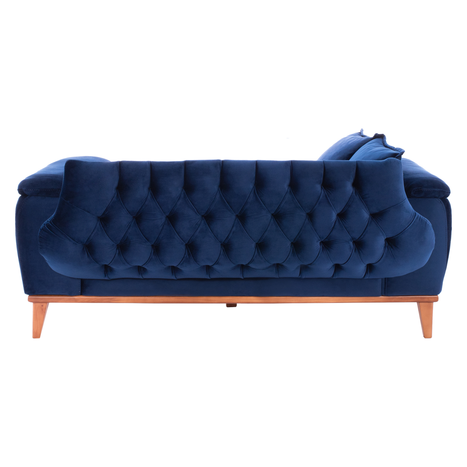 Αλλά δεν είναι μόνο το χρώμα και το καπιτονέ που κάνουν αυτόν τον καναπέ να ξεχωρίζει. Τα πόδια είναι ψηλά και ακριβώς πάνω από τα πόδια υπάρχει ένα ξύλινο πλαίσιο που διατρέχει ολόκληρο τον καναπέ, σε φυσικό χρώμα ξύλου, με αποτέλεσμα να δημιουργείται μια πανέμορφη διχρωμία με το έντονο μπλε της επένδυσης.
